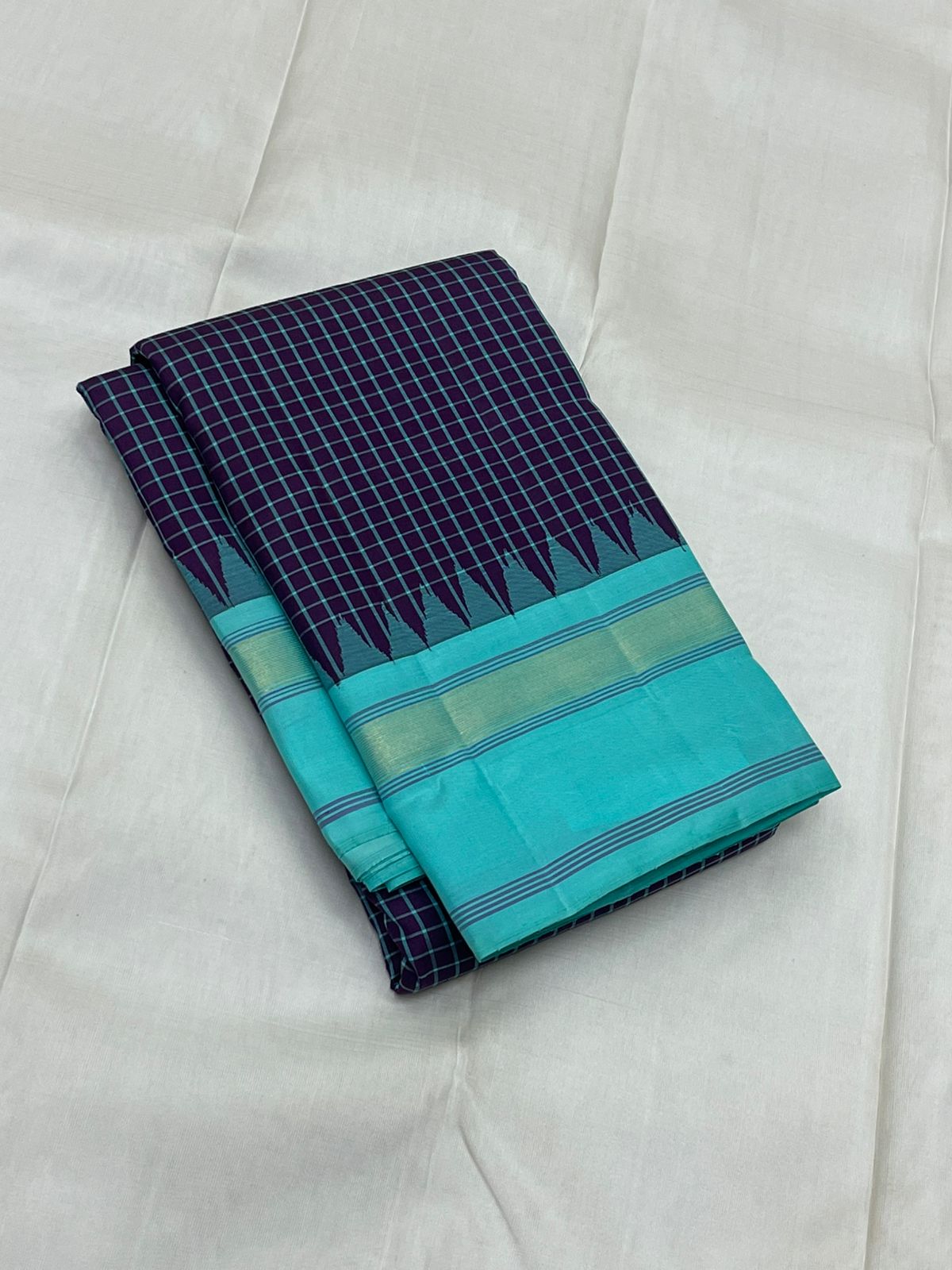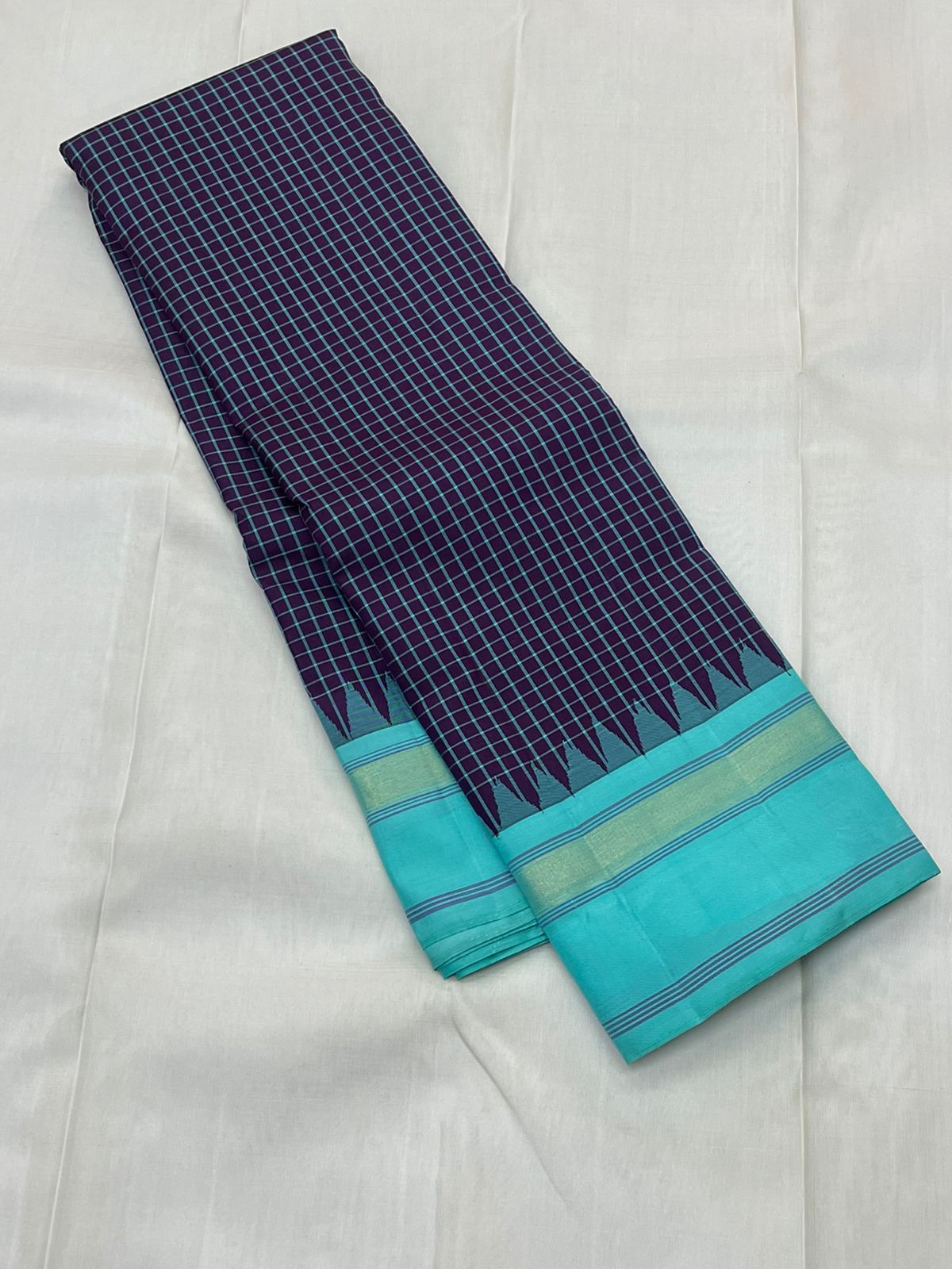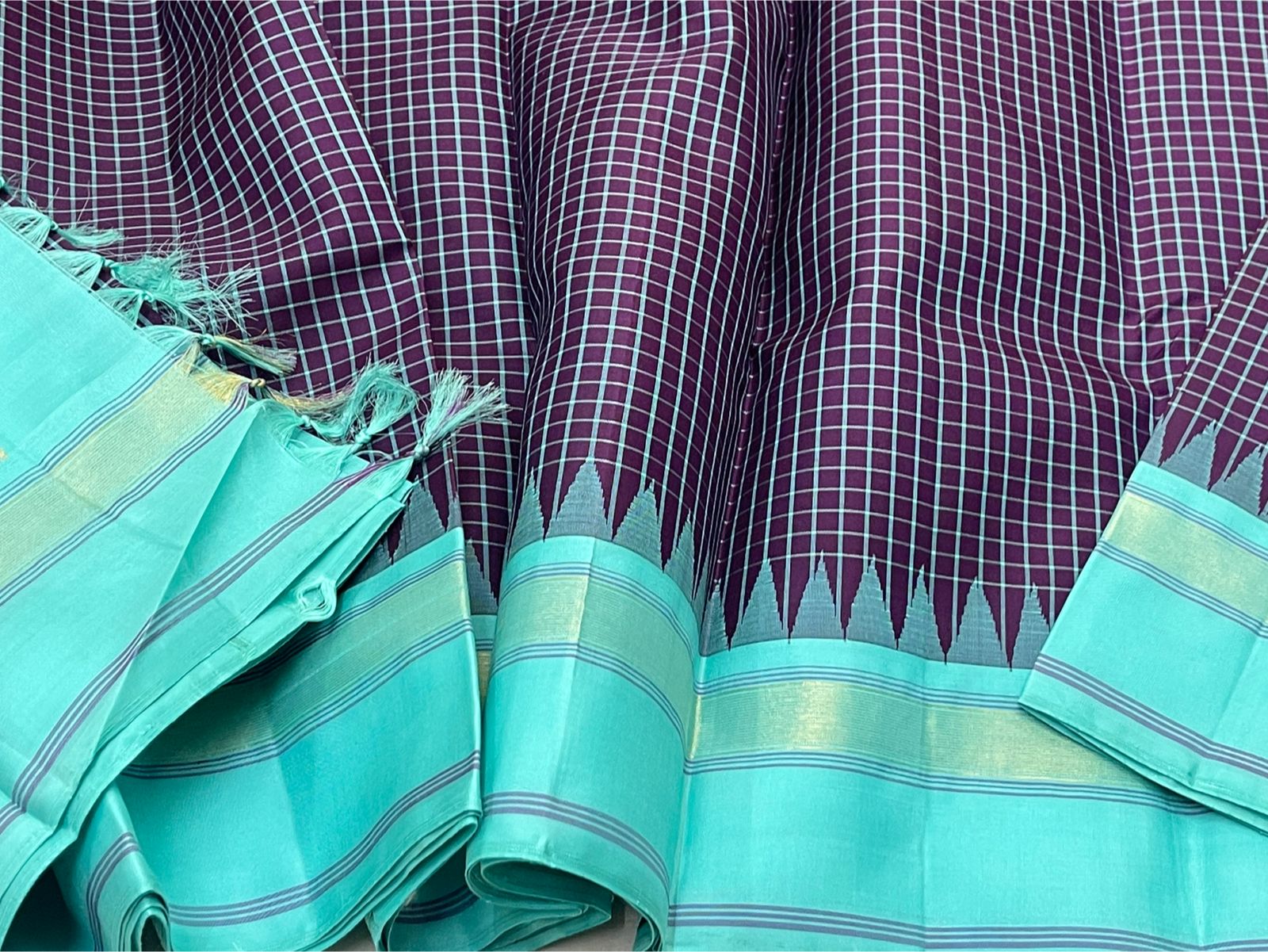 A modern classic in temple tradition. The body comes in a rich aubergine/plum tone woven with micro kattam (checks) in cool aqua. Sharp muthu–reku temple teeth frame the body and flow into contrast sea-green korvai borders accented with fine gold zari stripes. The pallu continues in sea-green with vertical zari lines and a stylized spear motif for a traditional finish. Paired with a matching sea-green blouse piece carrying the zari border.
