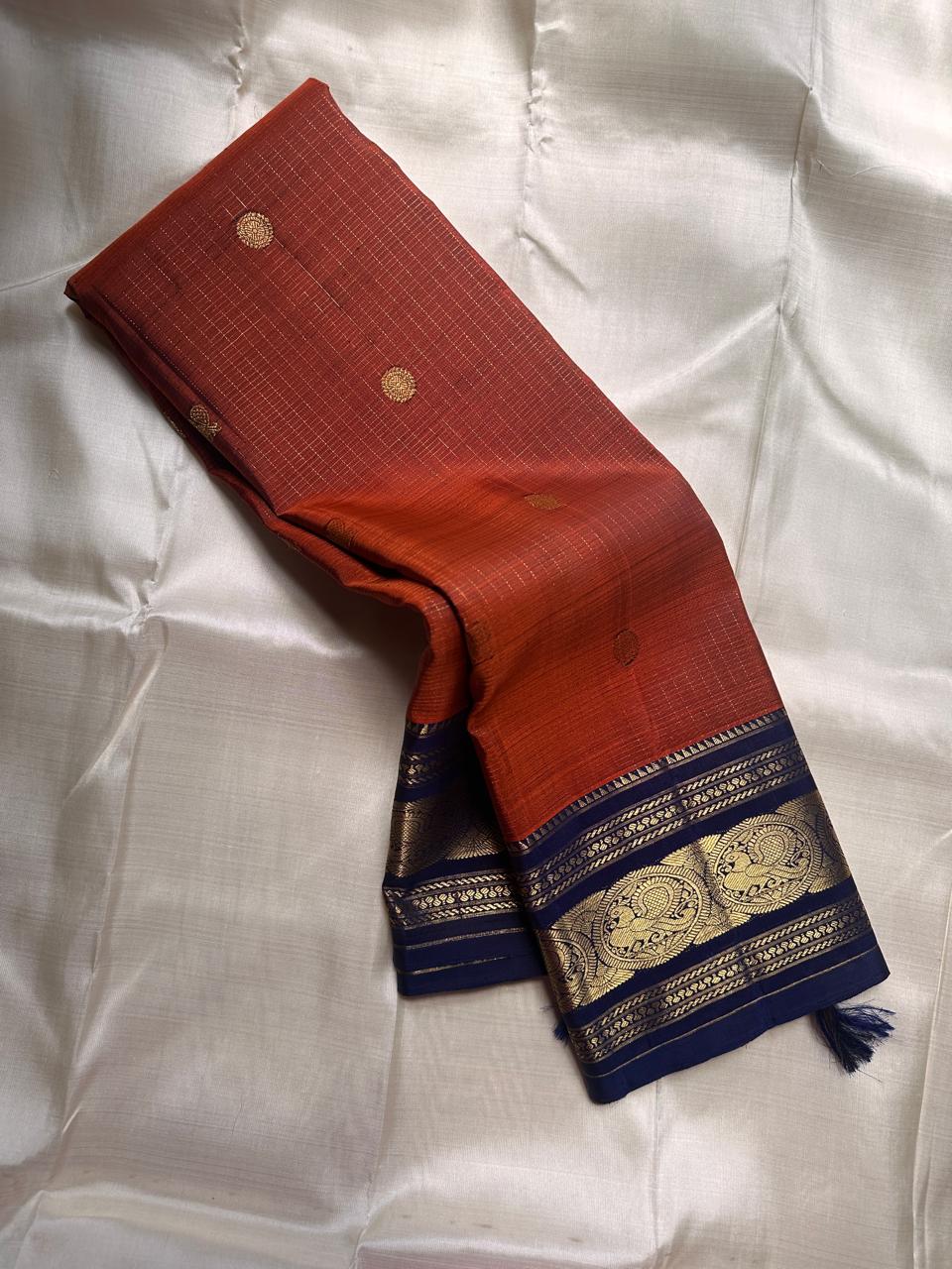 A stunning korvai handloom in rich rust-orange with delicate podi kattam checks and gold chakram buttas, paired with a deep neelam (midnight navy) korvai border. The border is adorned with intricate annam chakram motifs, temple-inspired vine panels, and a touch of tradition in every thread. The grand neelam zari-brocade pallu brings a royal finish, making this saree perfect for weddings and festive occasions.