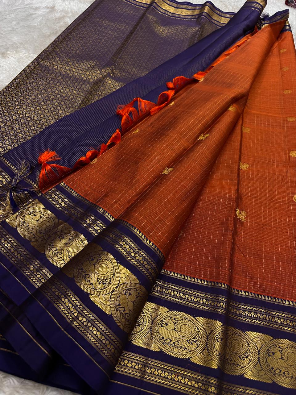 Rust Orange Neelam – Korvai Kanchipuram Silk Saree Pure handloom silk | Rust-orange micro checks with gold chakram buttas Neelam korvai border with annam chakram motifs & temple stripes Grand zari-brocade neelam pallu | Contrast blouse | Fall & Pico Do
