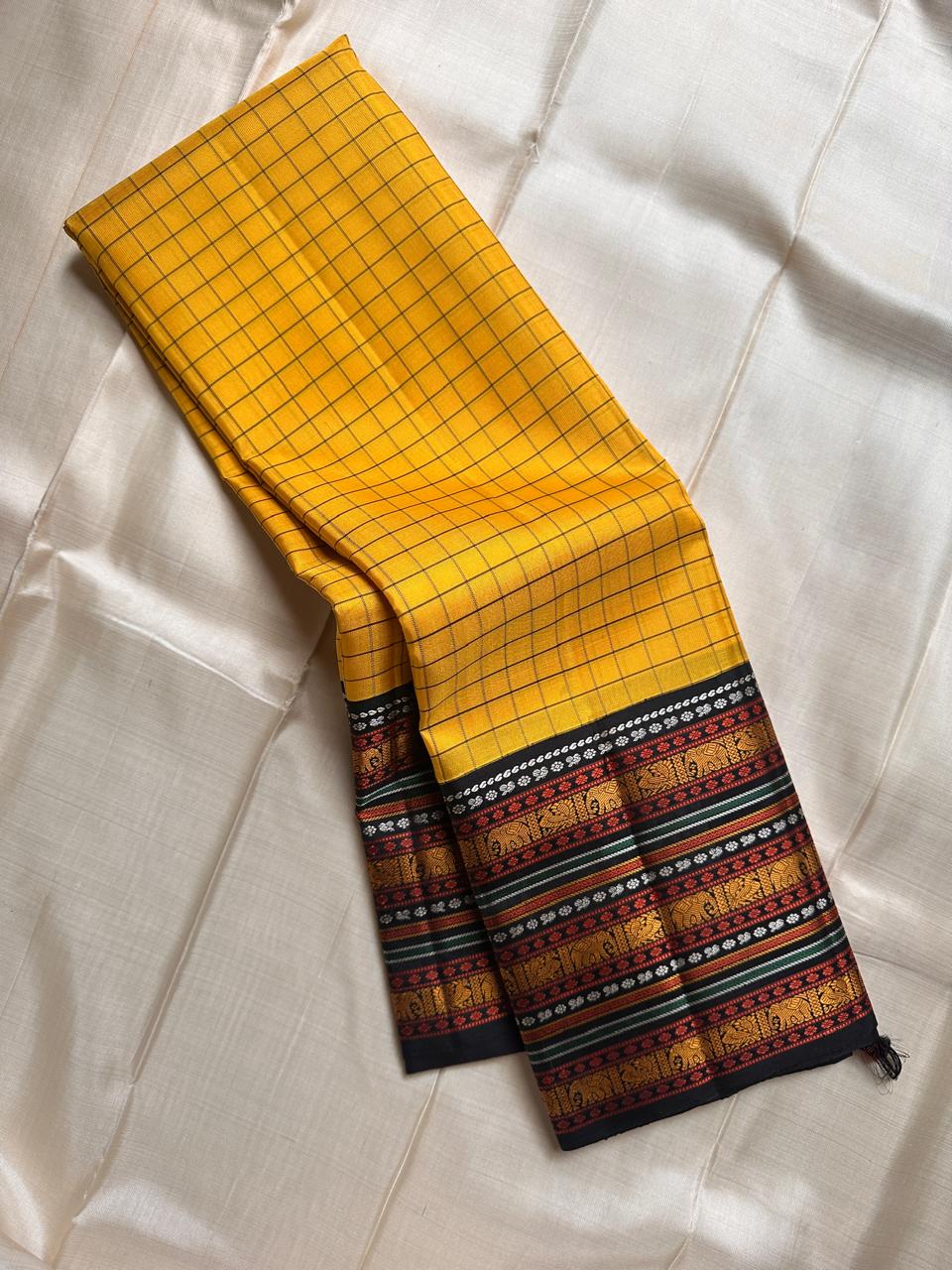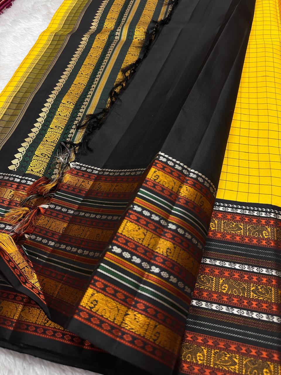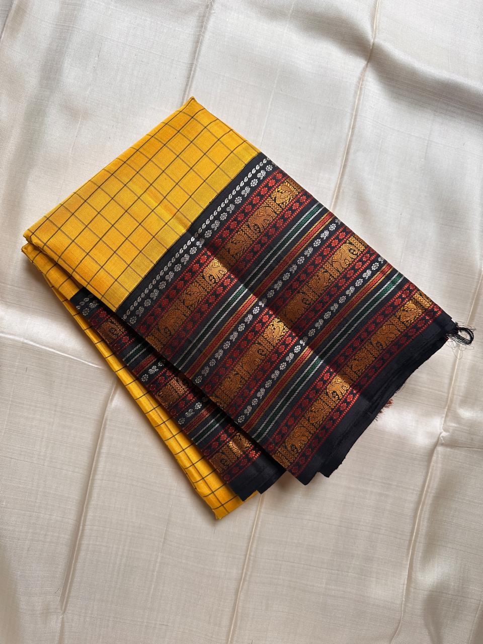 Marigold Mani Kattam – Pure Kanchipuram Silk Saree Vibrant marigold yellow body with classic kattam checks black borders with elephant & floral zari motifs Rich black pallu adorned with green & zari stripes . Silk Mark Certified, delivery in 2 weeks