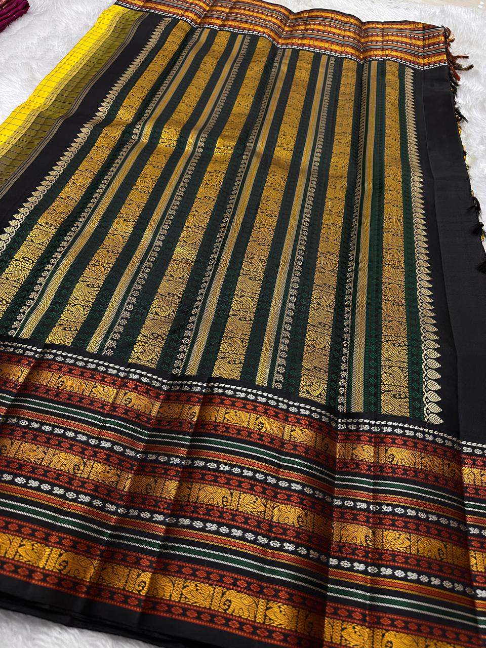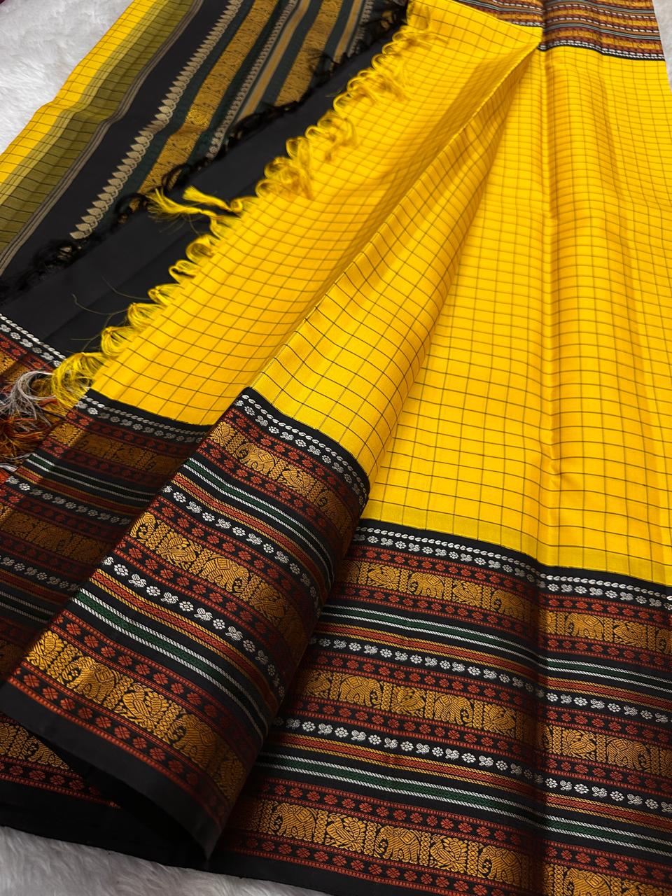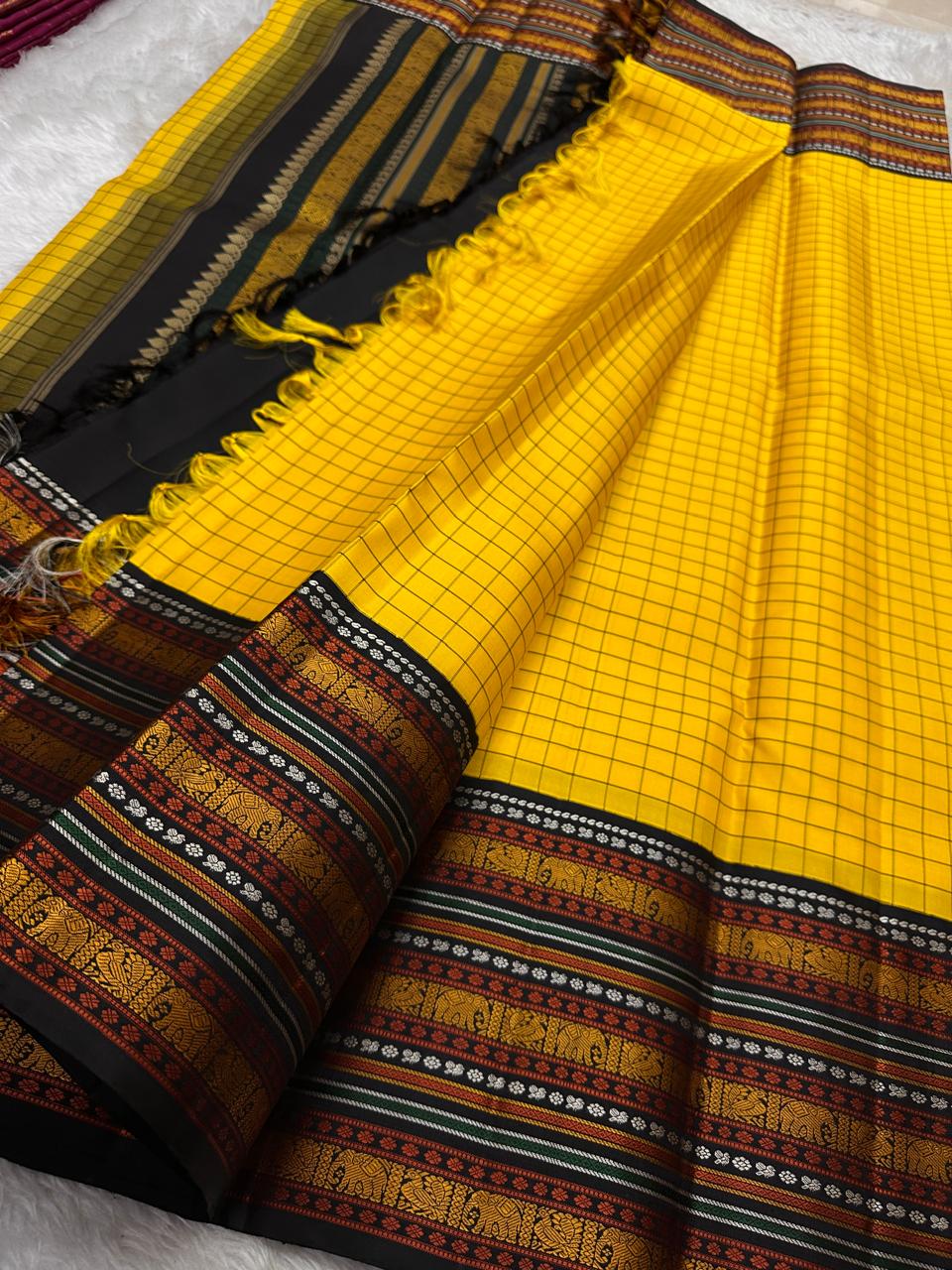 Marigold Mani Kattam – Pure Kanchipuram Silk Saree Vibrant marigold yellow body with classic kattam checks black borders with elephant & floral zari motifs Rich black pallu adorned with green & zari stripes . Silk Mark Certified, delivery in 2 weeks