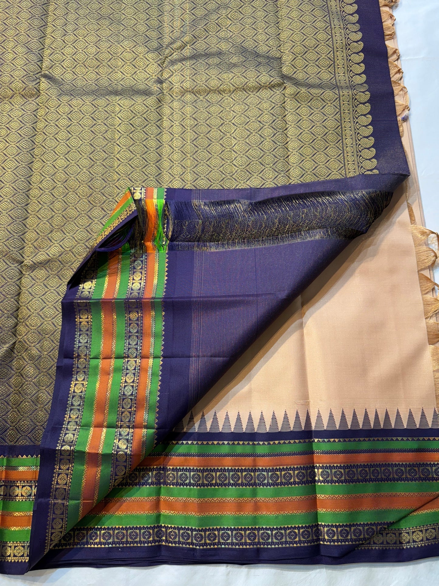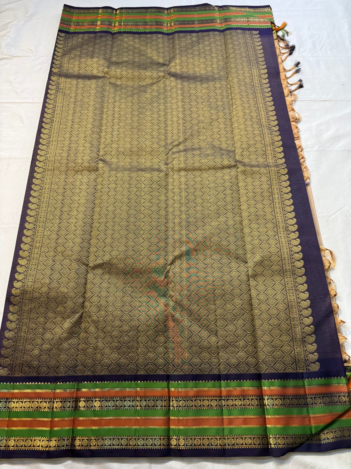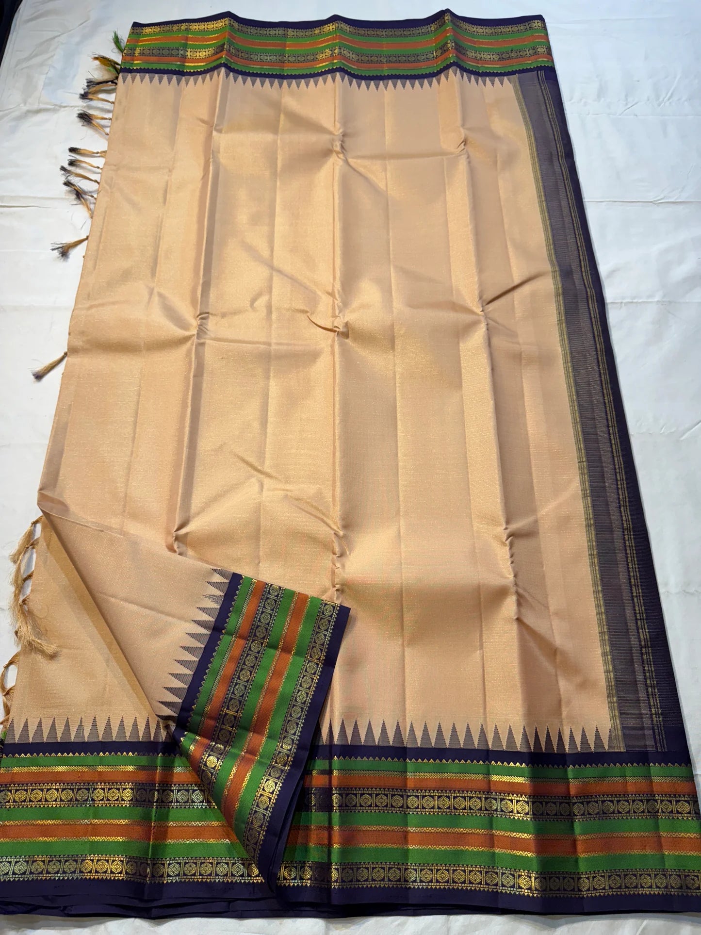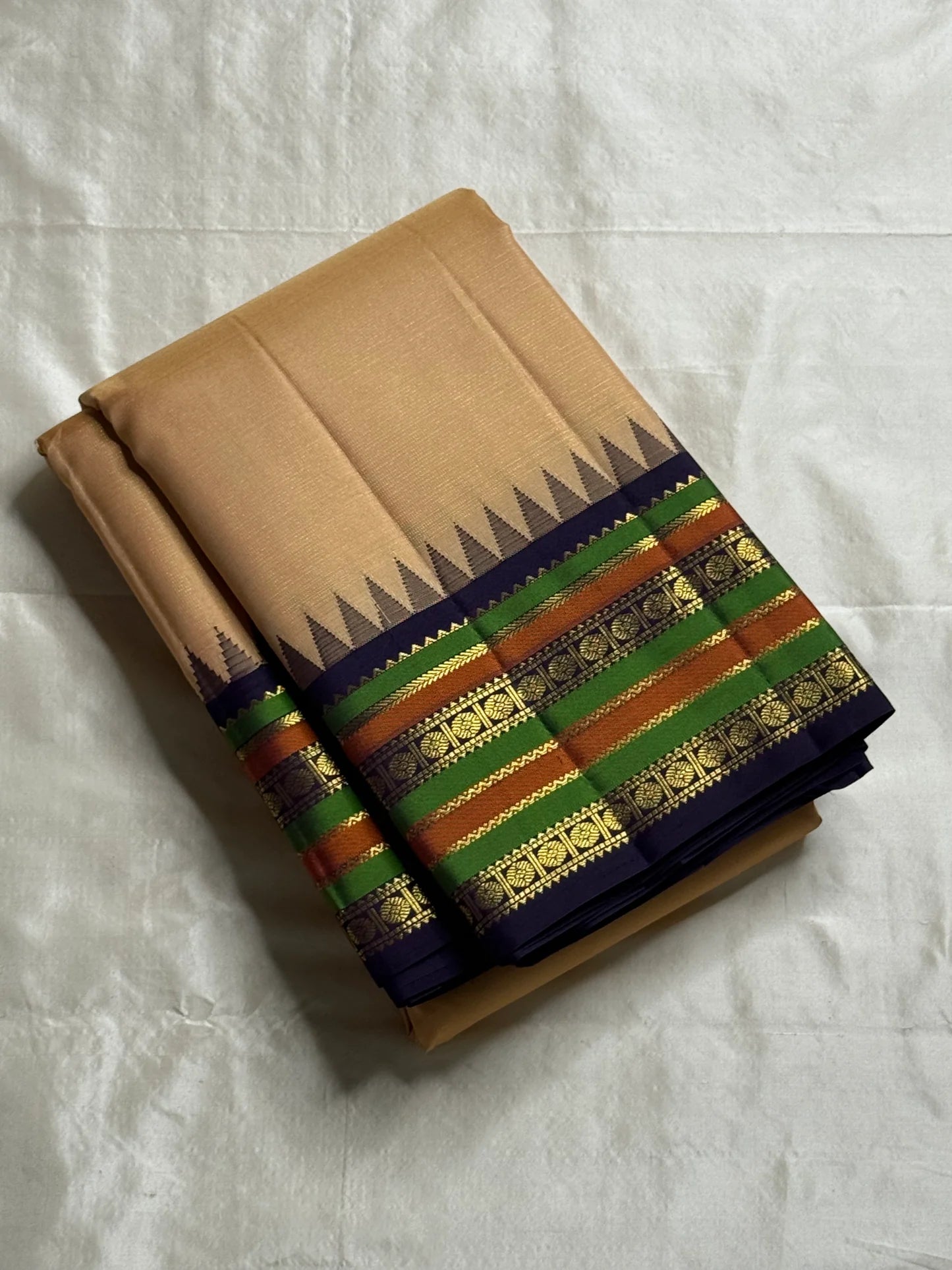 Sandal Temple – Pure Silk Kanchipuram Saree Sandal Body with mild sheen , pillayar moggu ✨ Indigo-Purple Korvai Border with Green & Ochre Stripes Temple Gopuram Zari Edging & Grand Brocade Pallu Silk Mark Certified | ships in two weeks