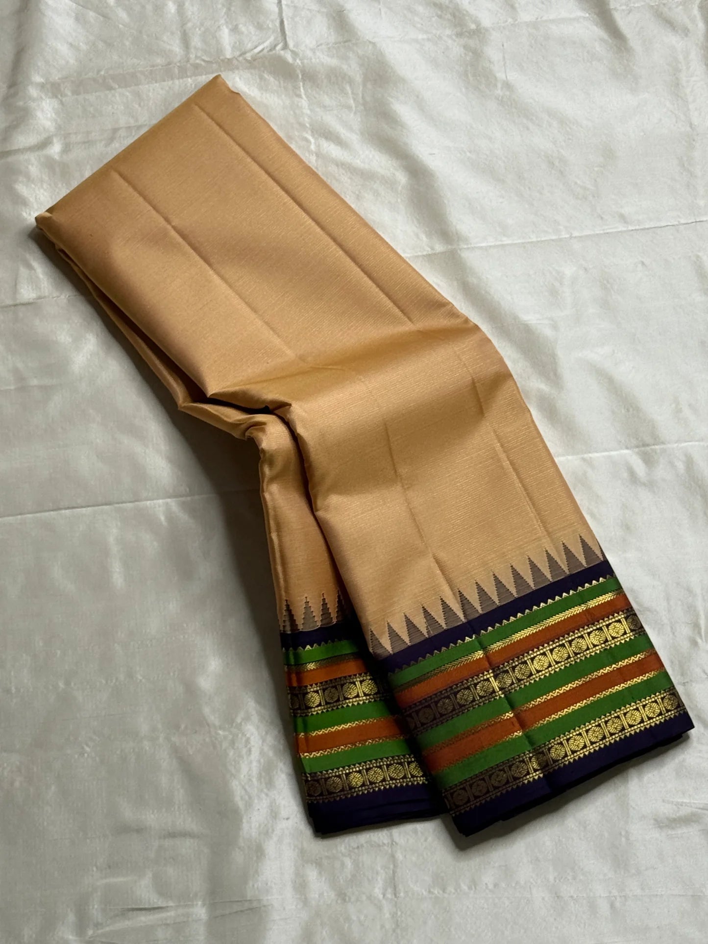 Pure Silk Kanchipuram Saree – Sandal Body with Multicolor Temple Border & Grand Brocade Pallu