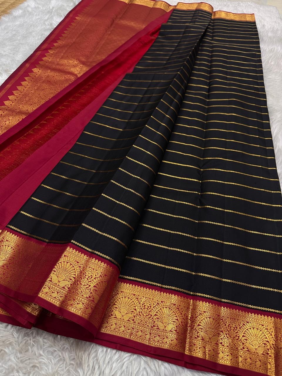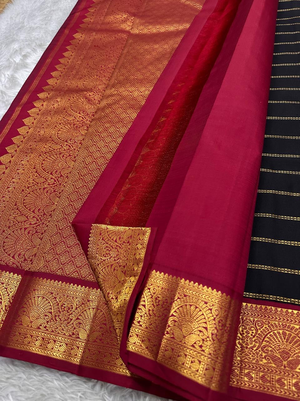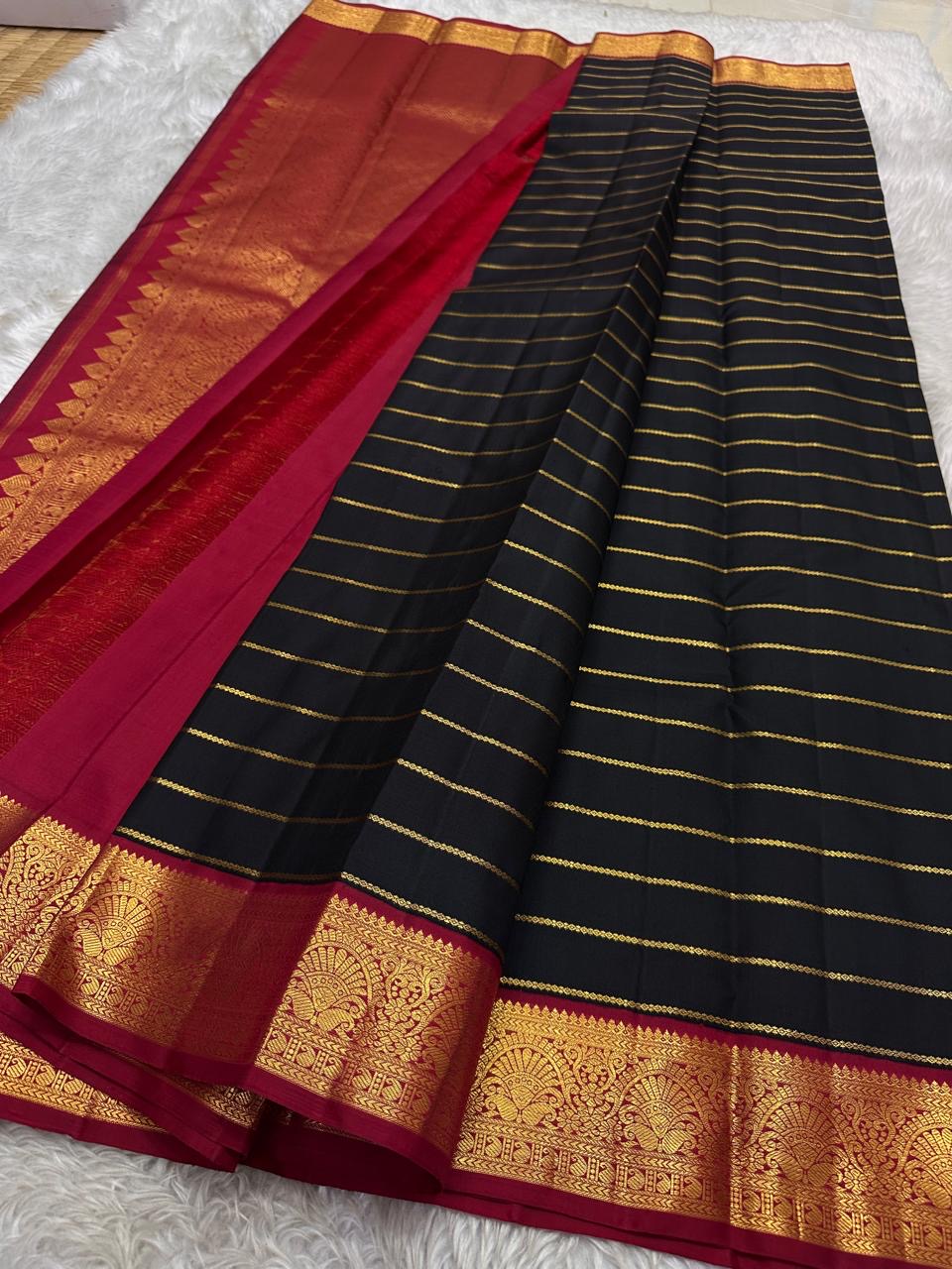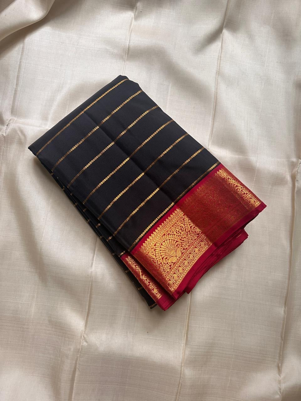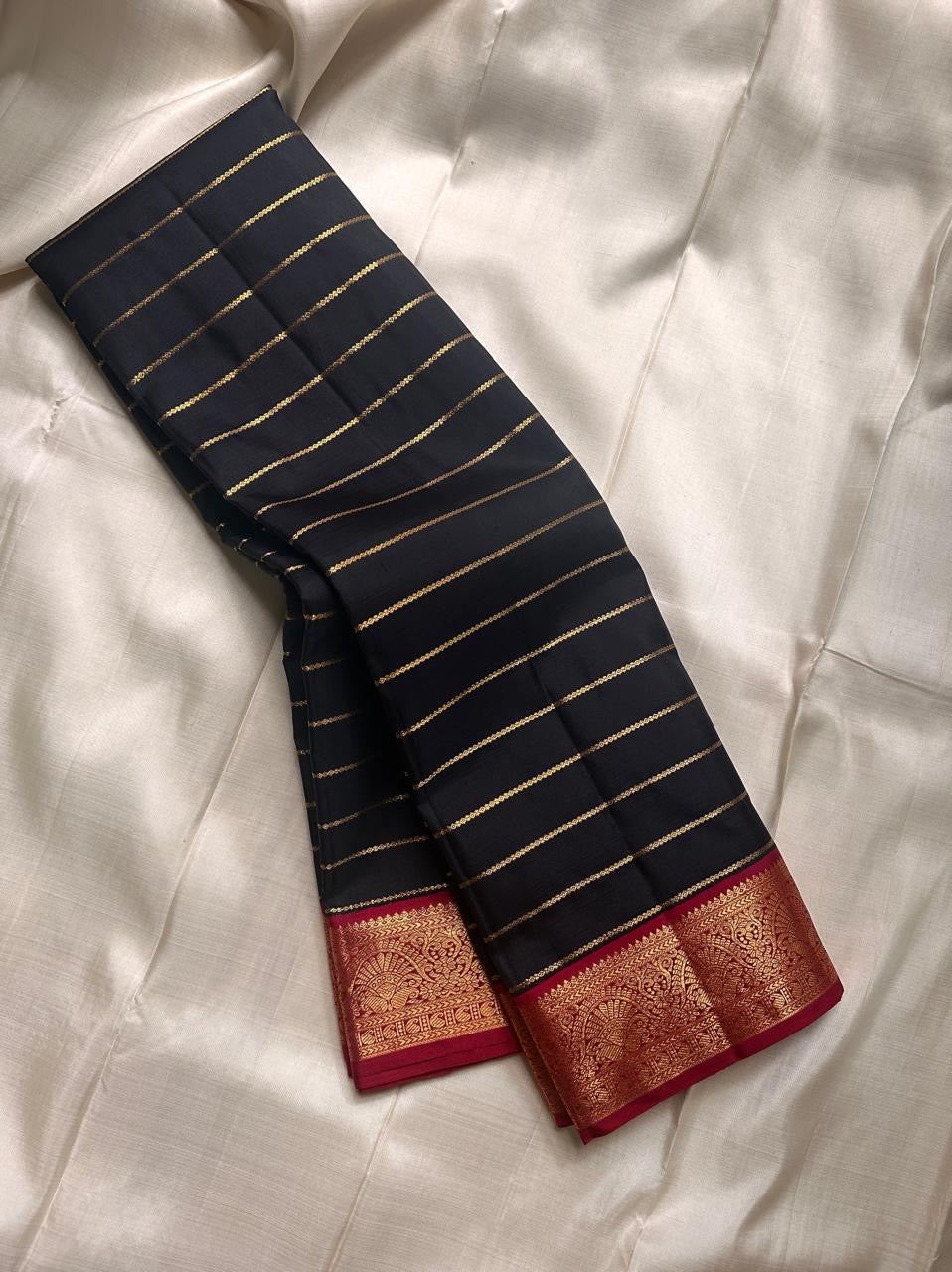 View compareBlack with Gold zari stripes , thandavalam stripes run across the body like rays of light. Framed with a bold red border