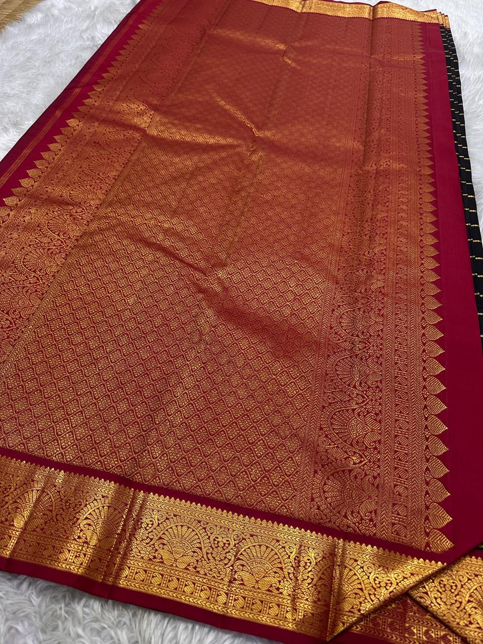 Black with Gold zari stripes , thandavalam stripes run across the body like rays of light. Framed with a bold red border