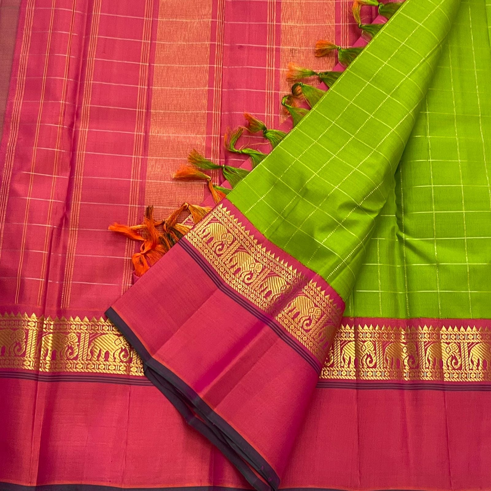 Valli Pachai – Kanchipuram Pure Silk Saree Parrot-green body in kattam (grid) checks with subtle zari lines Korvai contrast rani-pink borders featuring gaja (elephant) procession & temple reku motifs Rich rani-pink zari pallu with vertical bands