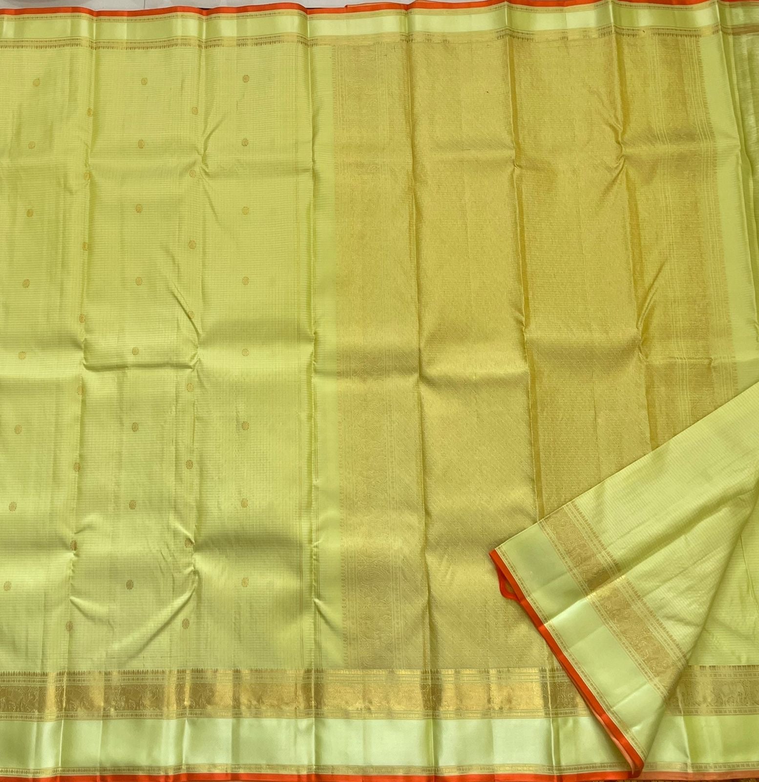 View compareMeadow Shine — Kanchipuram Pure Silk Saree Pastel meadow-green body with micro kattam checks & zari buttas Antique zari borders woven with vine & elephant motifs Warm kesari-orange selvedge a radiant edge . Silk mark cert. Free shipping within USA