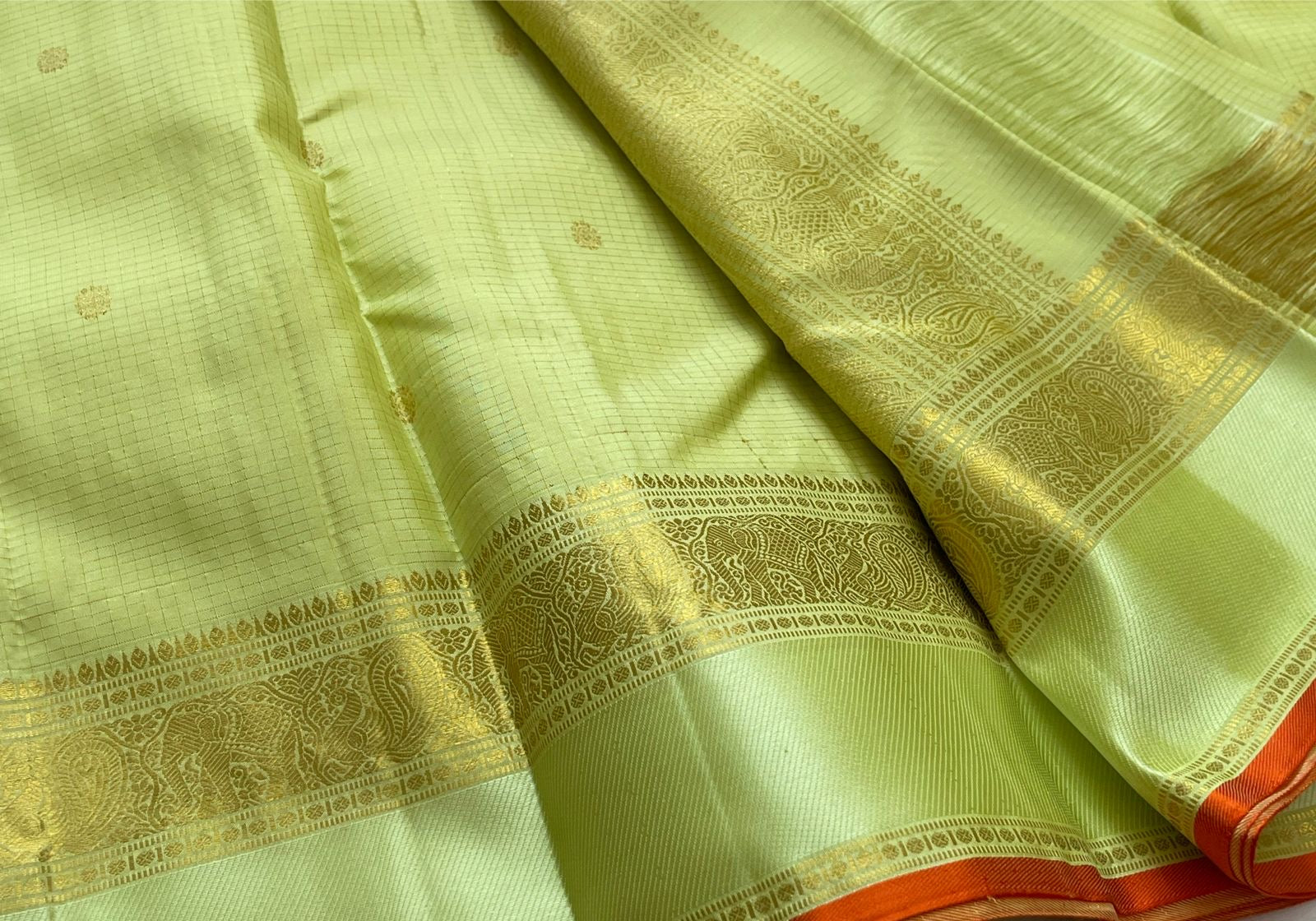 Meadow Shine — Kanchipuram Pure Silk Saree Pastel meadow-green body with micro kattam checks & zari buttas Antique zari borders woven with vine & elephant motifs Warm kesari-orange selvedge a radiant edge . Silk mark cert. Free shipping within USA
