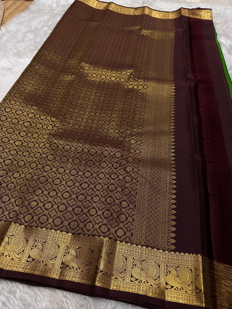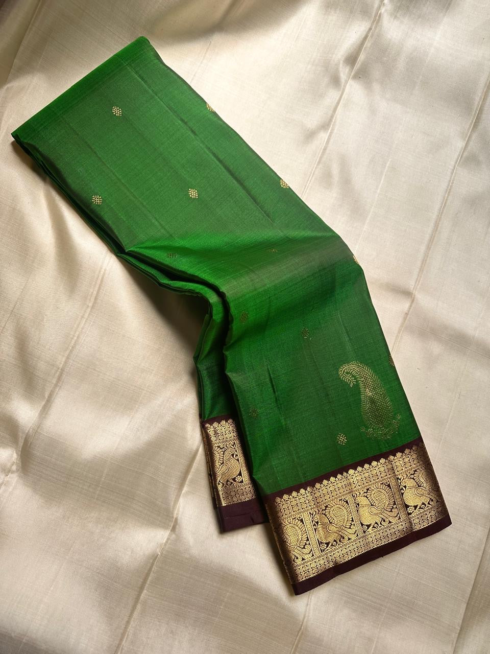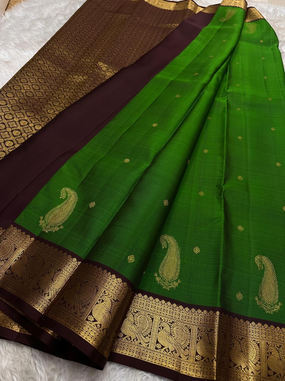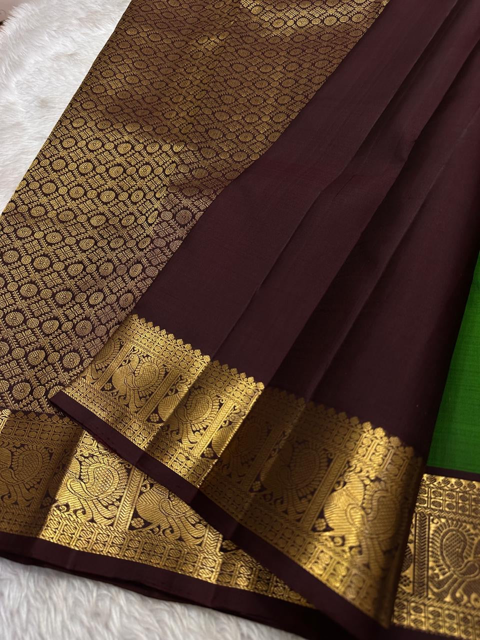 Shringaram – Green — Pure Silk Kanchipuram Emerald-green body with coin buttas & grand mango (mankolam) motifs Deep coffee-brown korvai borders with peacock panel zari Rich coffee-brown brocade pallu with circular & diamond jaal Silk mark