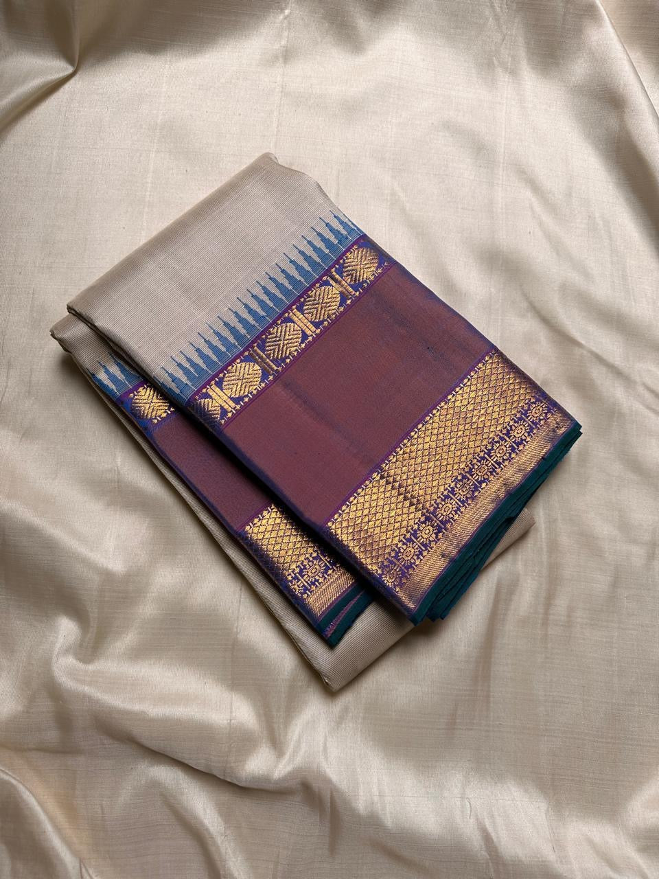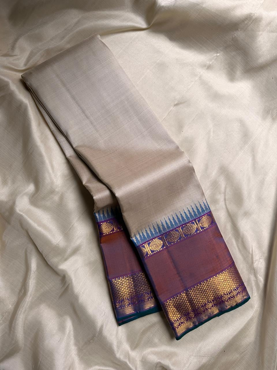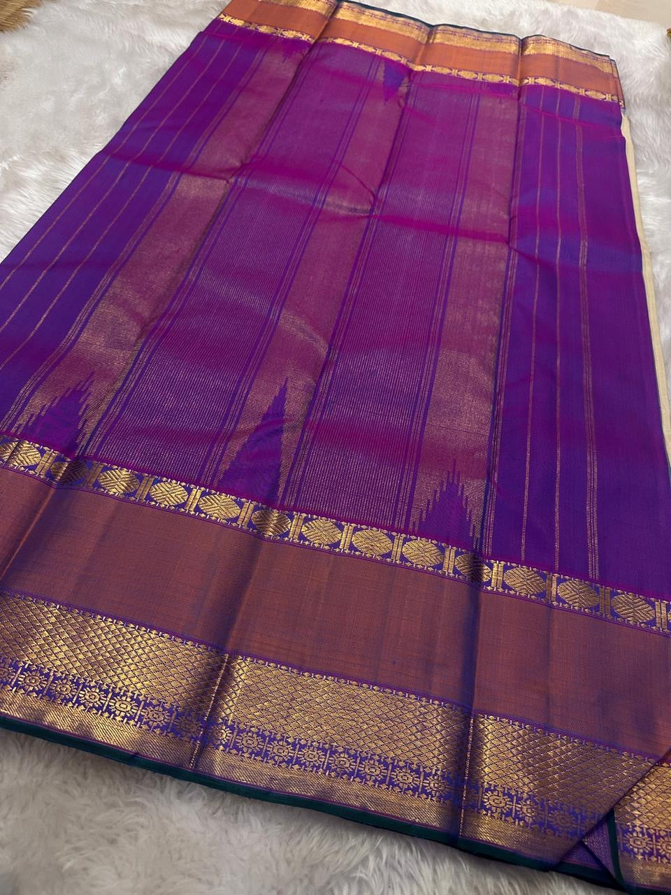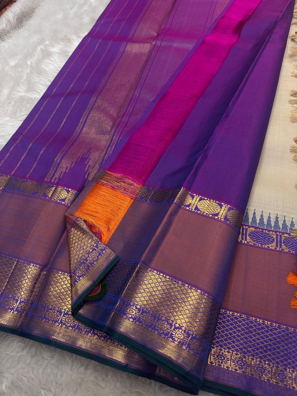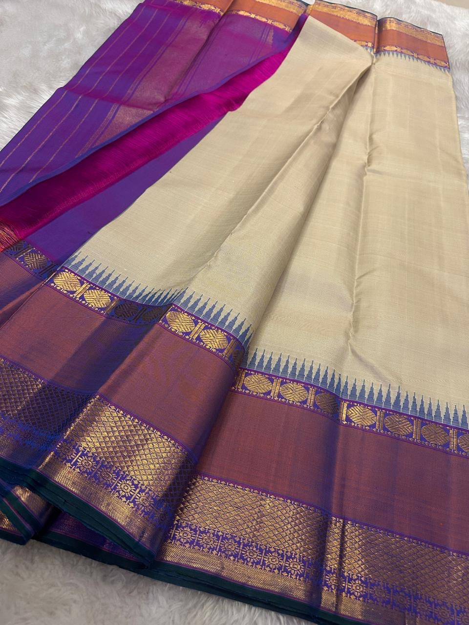 Vaidhehi – Ivory Kanchipuram Silk Saree A classic ivory silk saree with a shot purple-orange Rudraksham border and a rich Thazhampoo reku pallu—timeless elegance woven with tradition