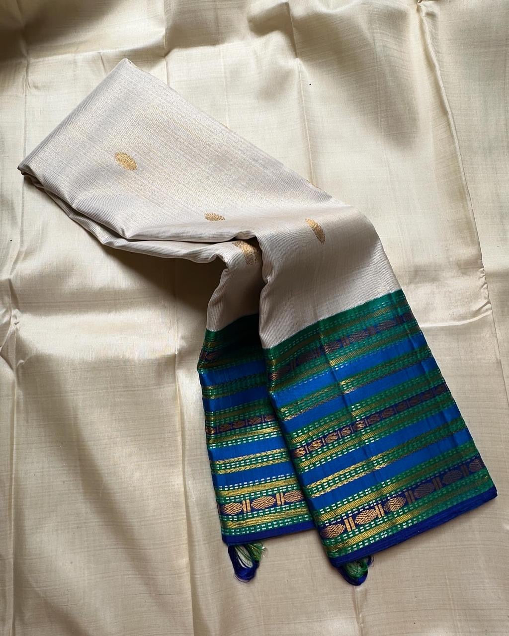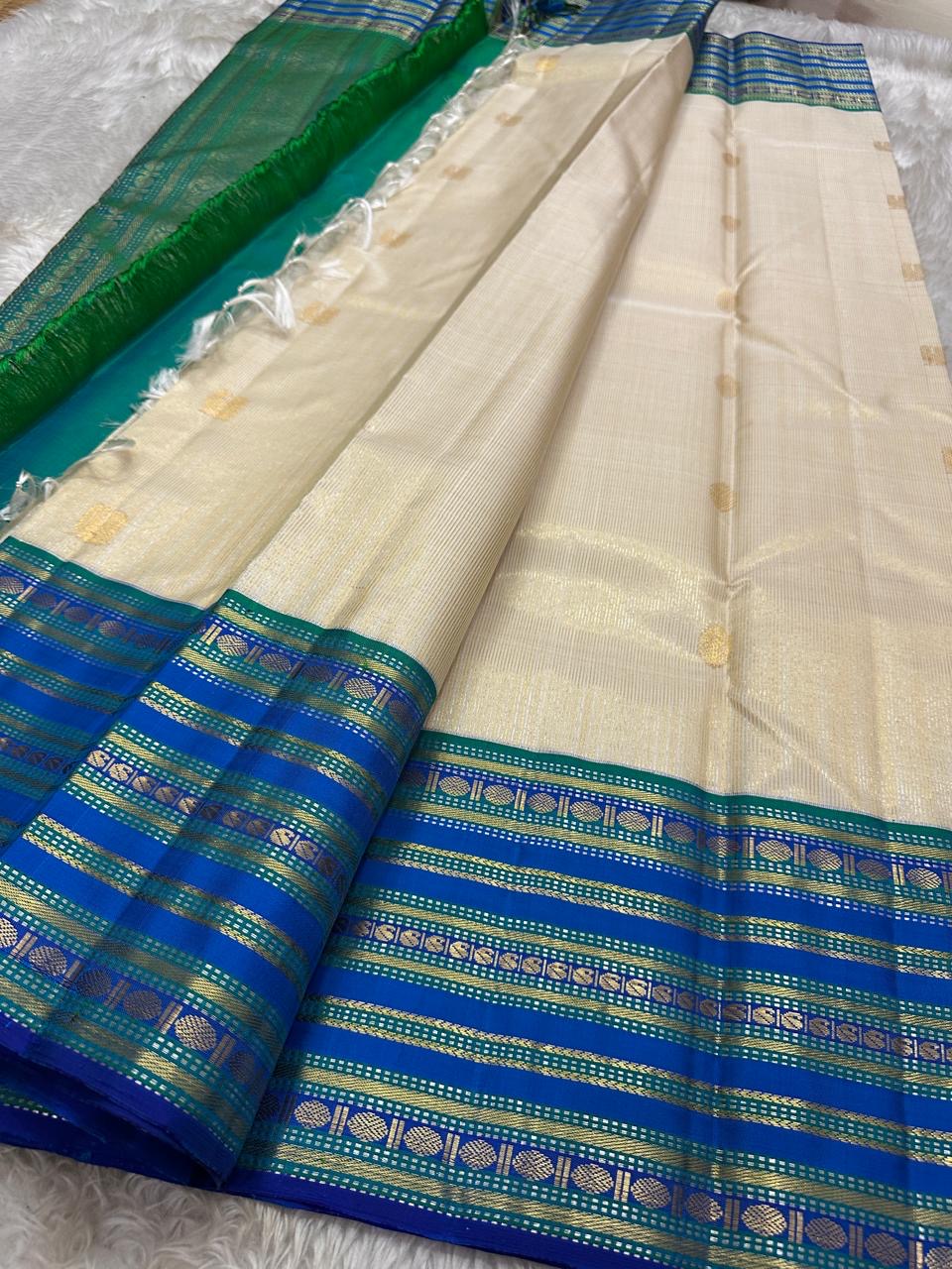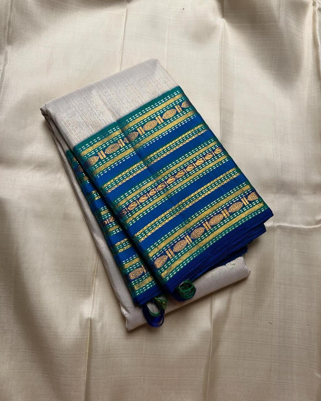 Pure silk kanchipuram handloom saree a unique white vairaoosi with blue sapphire varisaipet border with Rudhraksham motif