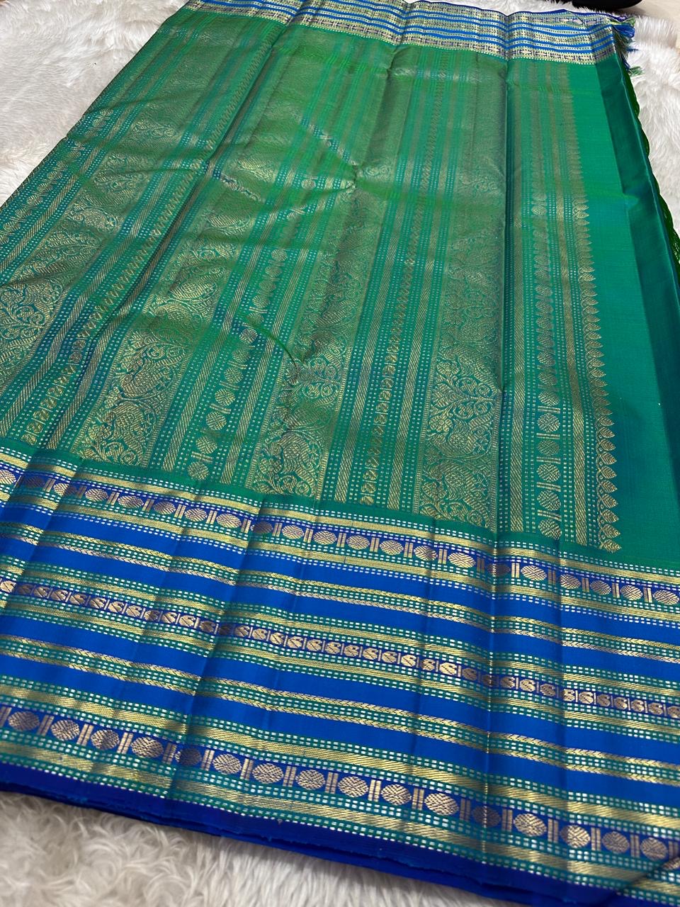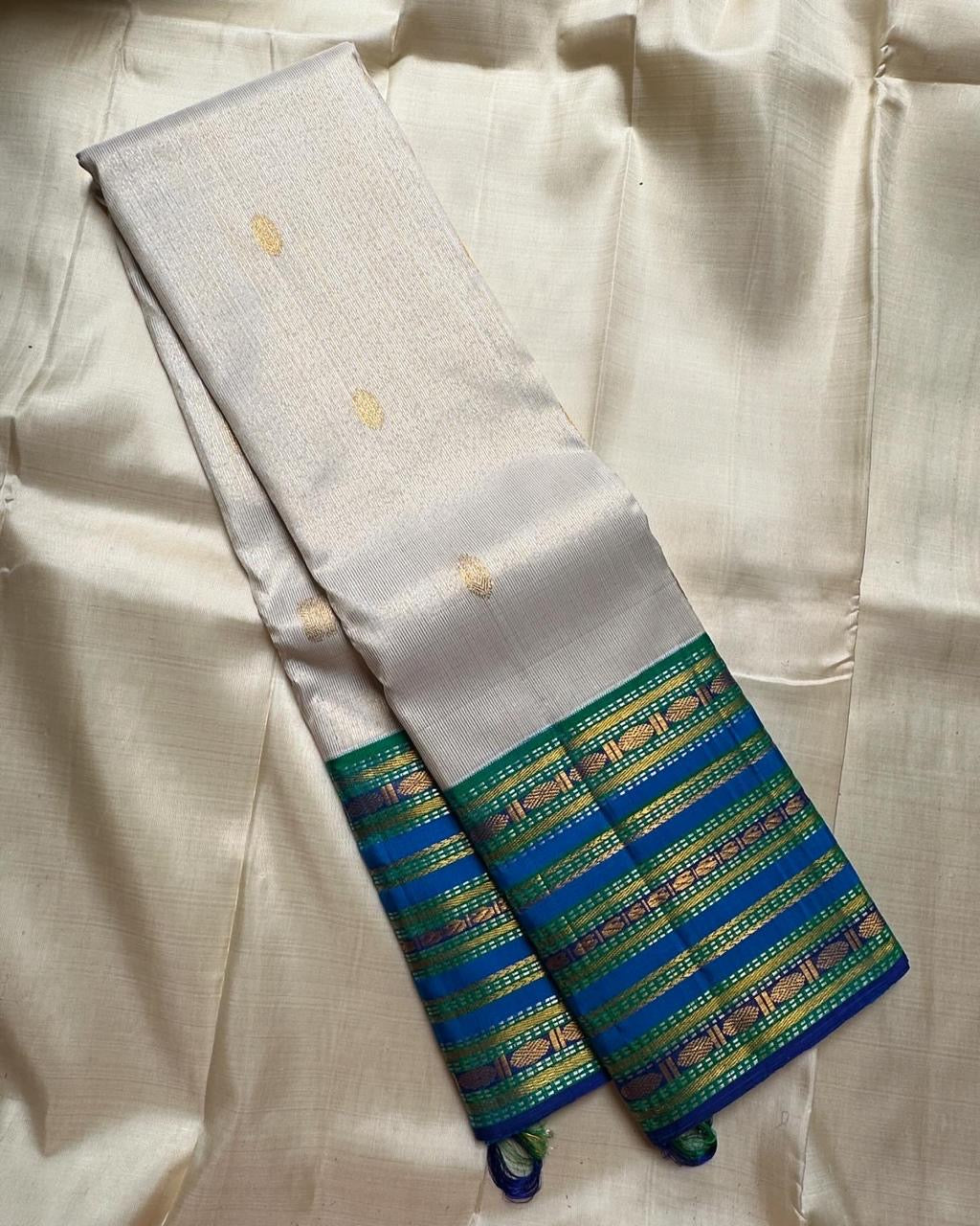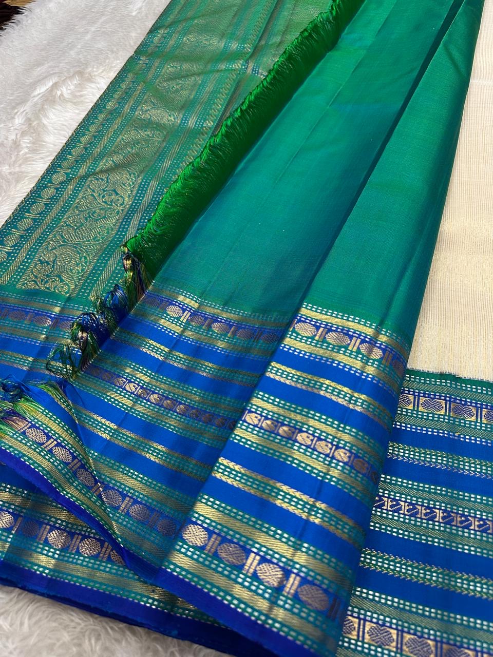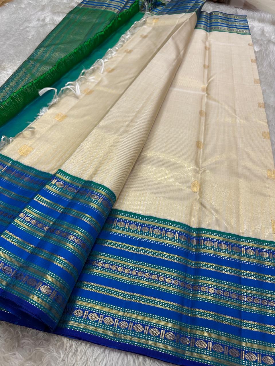 Pure silk kanchipuram handloom saree a unique white vairaoosi with blue sapphire varisaipet border with Rudhraksham motif