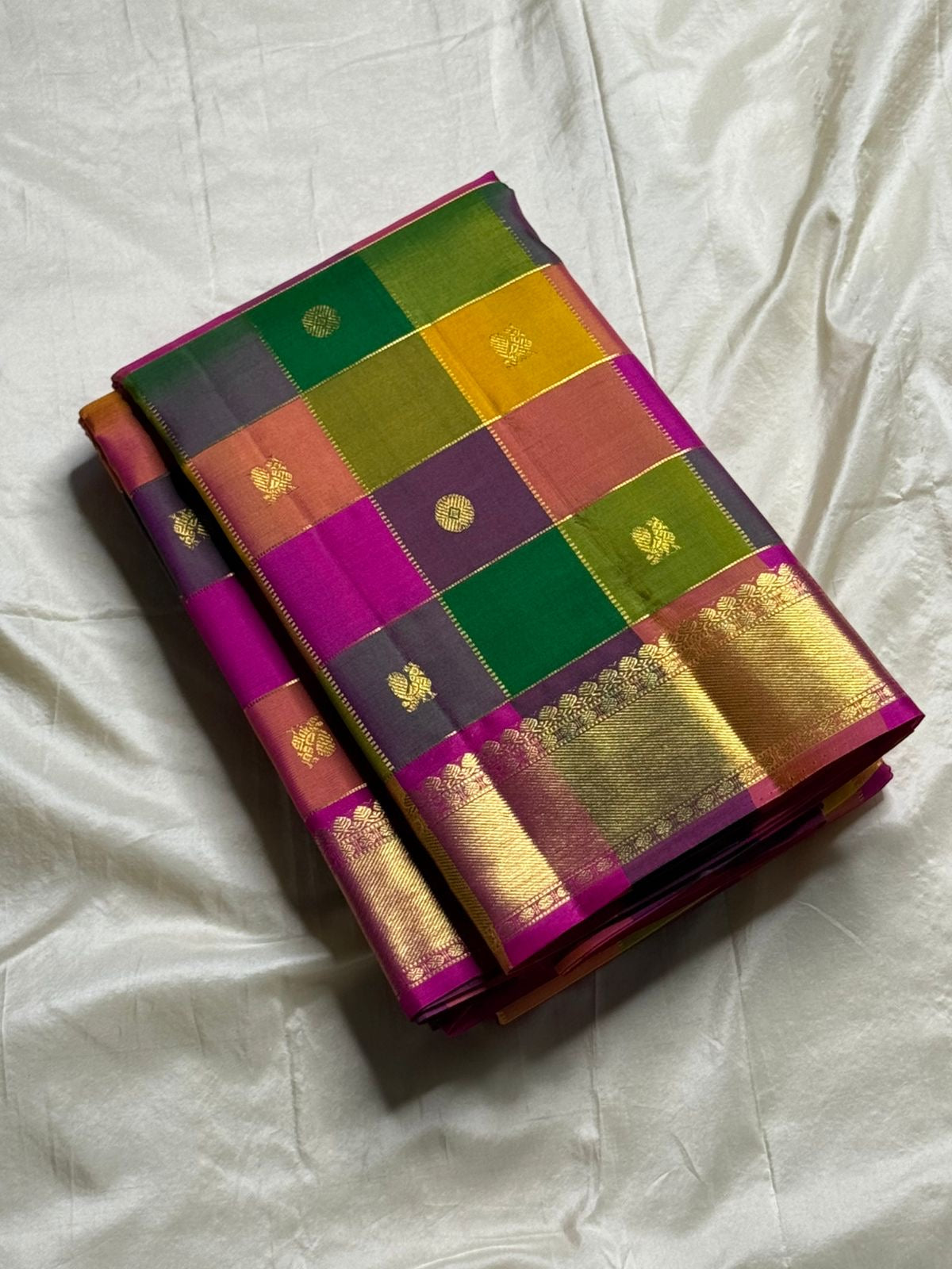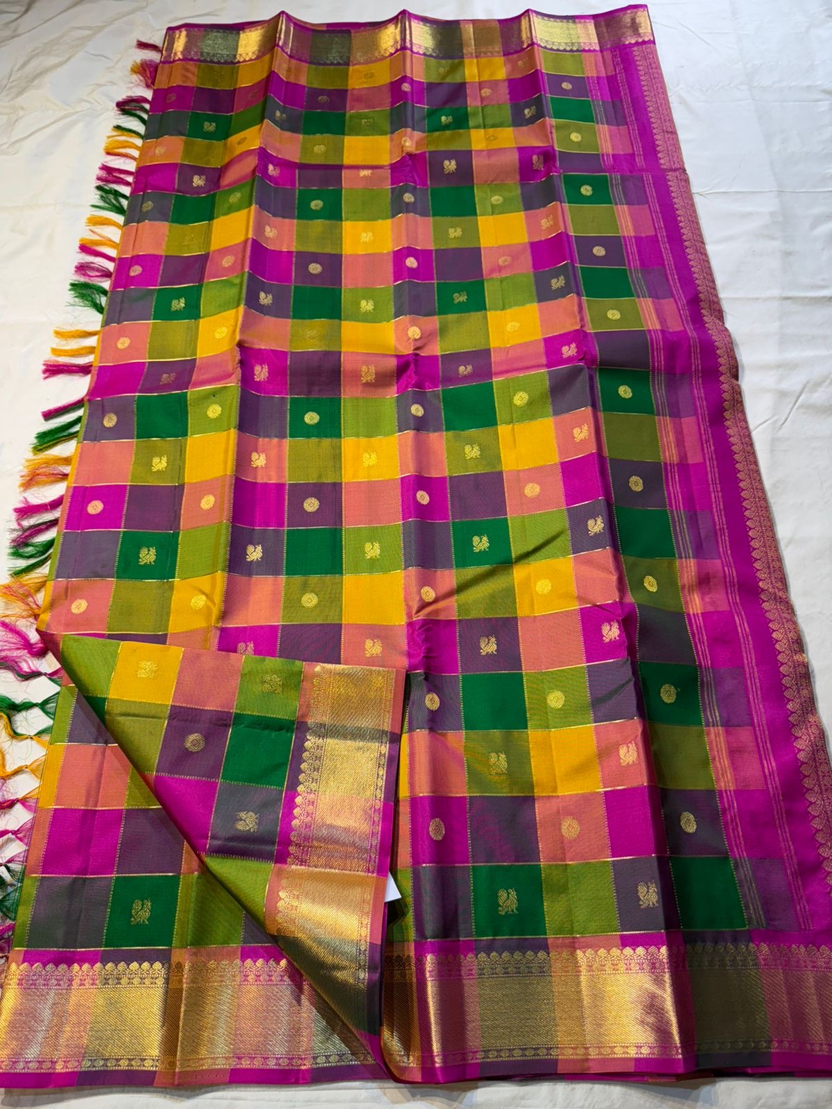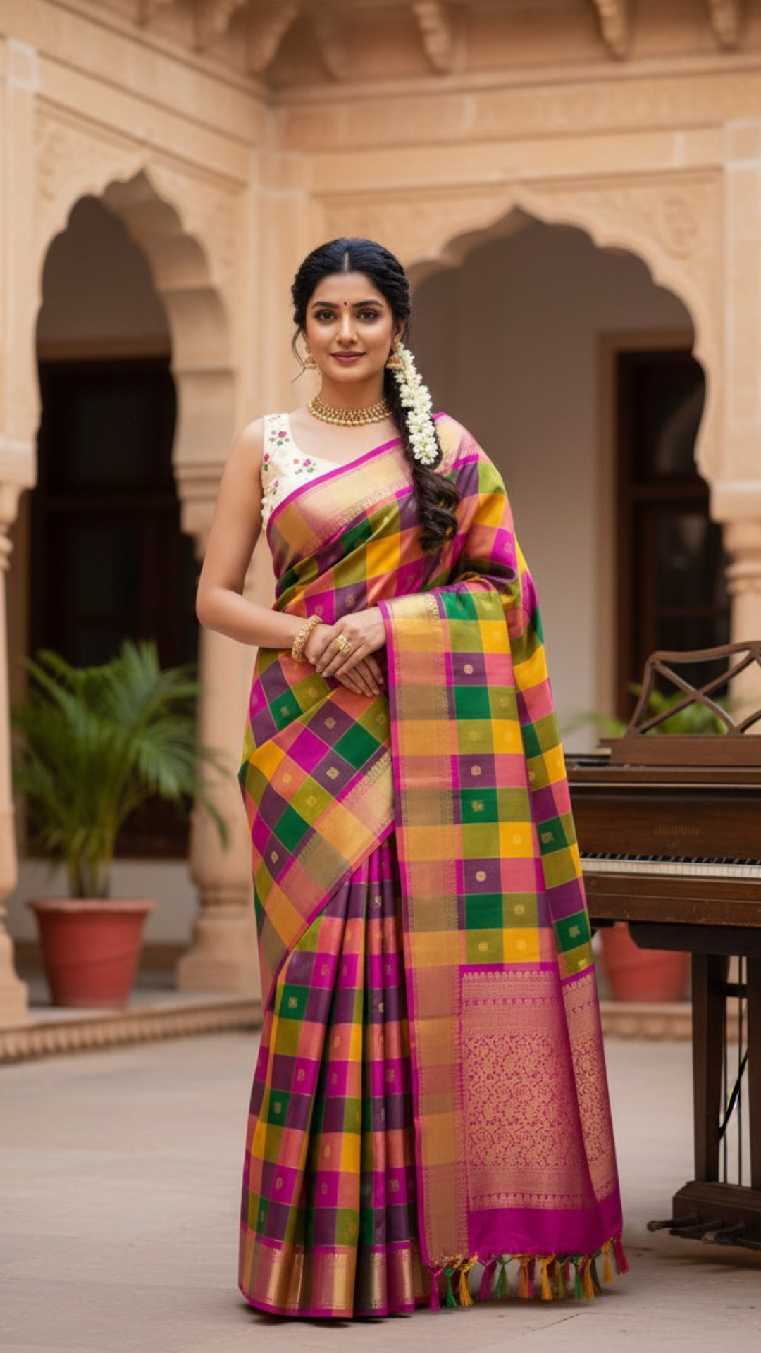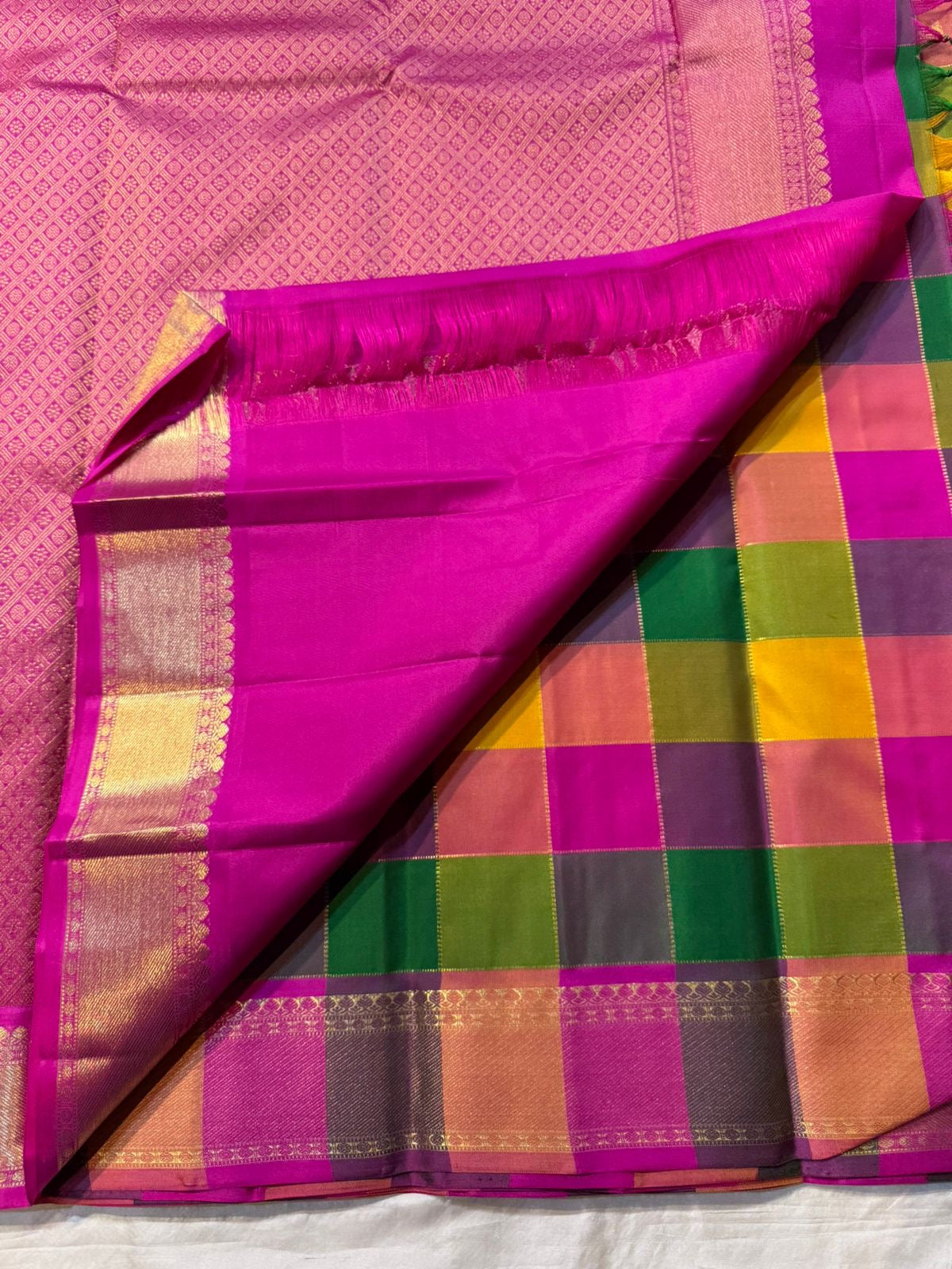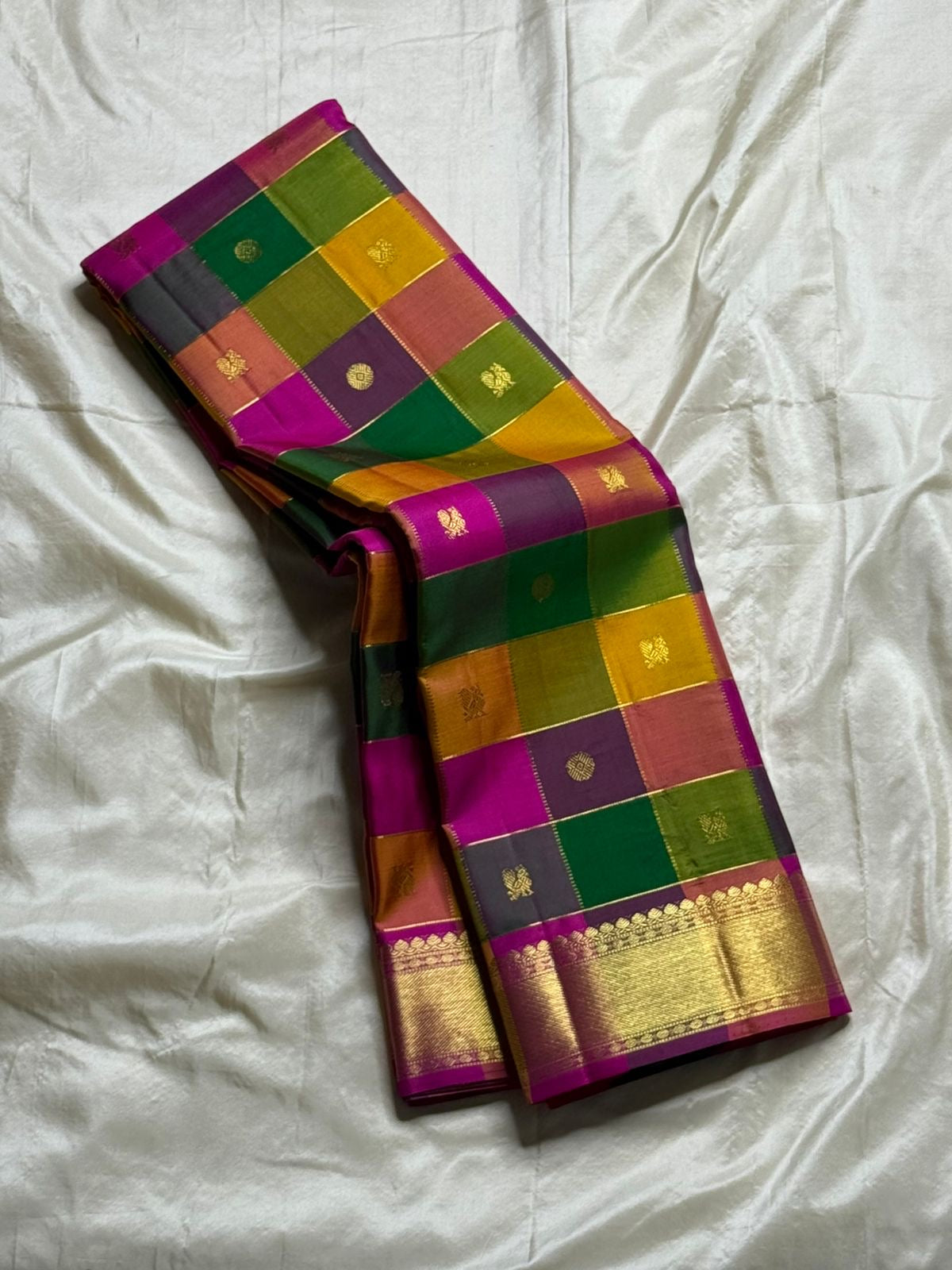 Pallavi – Kanchipuram Paalum pazhamum checks/ Zari kattam Silk Saree in Turmeric, Mango, Leaf Green & Beetroot Pink Checks. Finished with a vibrant magenta border and rich gold zari pallu.