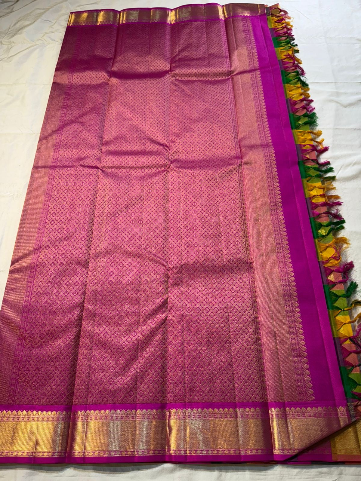 The vibrant magenta border, with intricate gold zari detailing, adds festive grandeur, while the richly woven pallu offers a regal finish to this playful yet heritage-steeped drape. Light dances across the saree’s surface, shifting tones between silk and sheen — making Pallavi the perfect choice for weddings, poojas, or any moment you want to bloom with color and grace.