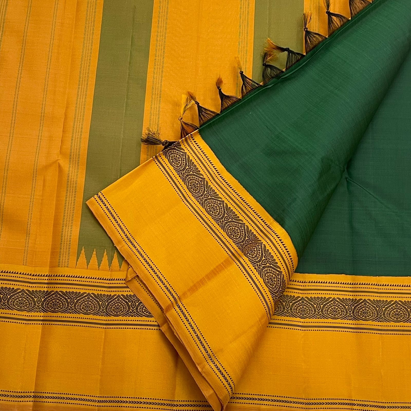 Maragatham & Mustard Saree: Shop this exquisite Green & Mustard Korvai Kanchipuram Pure Silk. Features fine Temple Borders and a striped Varisaipettu Pallu. Silk Mark Certified. Ready to ship in 1 week. Perfect for Diwali & Weddings.