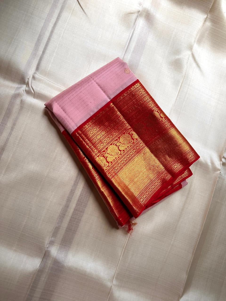 View comparePadma Kungumam — Pure Silk Kanchipuram Saree Soft lotus-pink body with delicate gold coin buttas and fine oosi stripes, paired with a kumkum-red korvai border in antique-gold lotus brocade. Silk Mark Certified • Blouse Stitching ($30) • Free USA Shipping