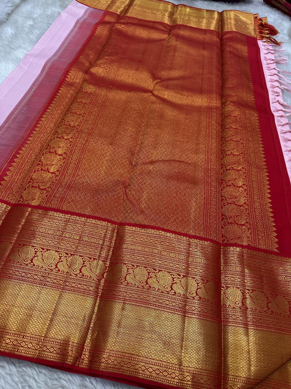 A serene padma (lotus) pink meets auspicious kumkum red—the classic temple pairing for poojas and festive evenings. The soft pin-stripes and scattered buttas add a dew-kissed shimmer, while the gold lotus brocade celebrates prosperity and grace.