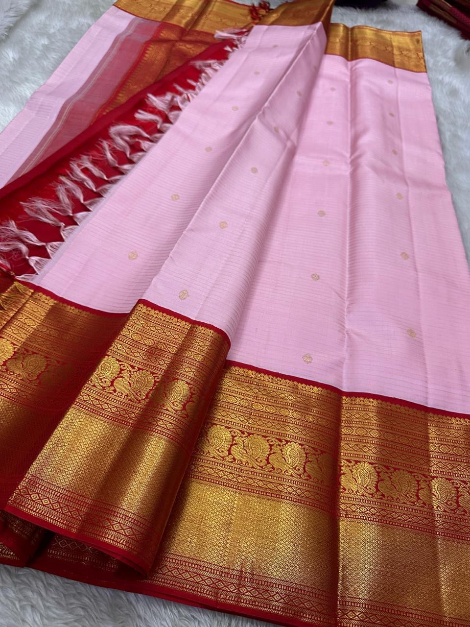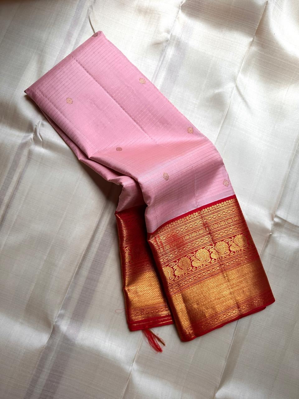 Padma Kungumam — Pure Silk Kanchipuram Saree Soft lotus-pink body with delicate gold coin buttas and fine oosi stripes, paired with a kumkum-red korvai border in antique-gold lotus brocade. Silk Mark Certified • Blouse Stitching ($30) • Free USA Shipping