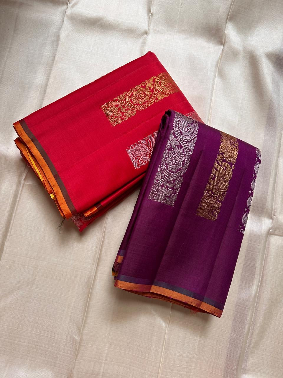 View compareLavanya– radiant purple Handwoven Kanchipuram Silk Saree in purple with Gold & Silver Zari, this deep purple Kanchipuram silk saree with intricate motifs in gold and silver zari, including Gandaberunda, parrots, elephants &lotuses as seen on Nita Ambani