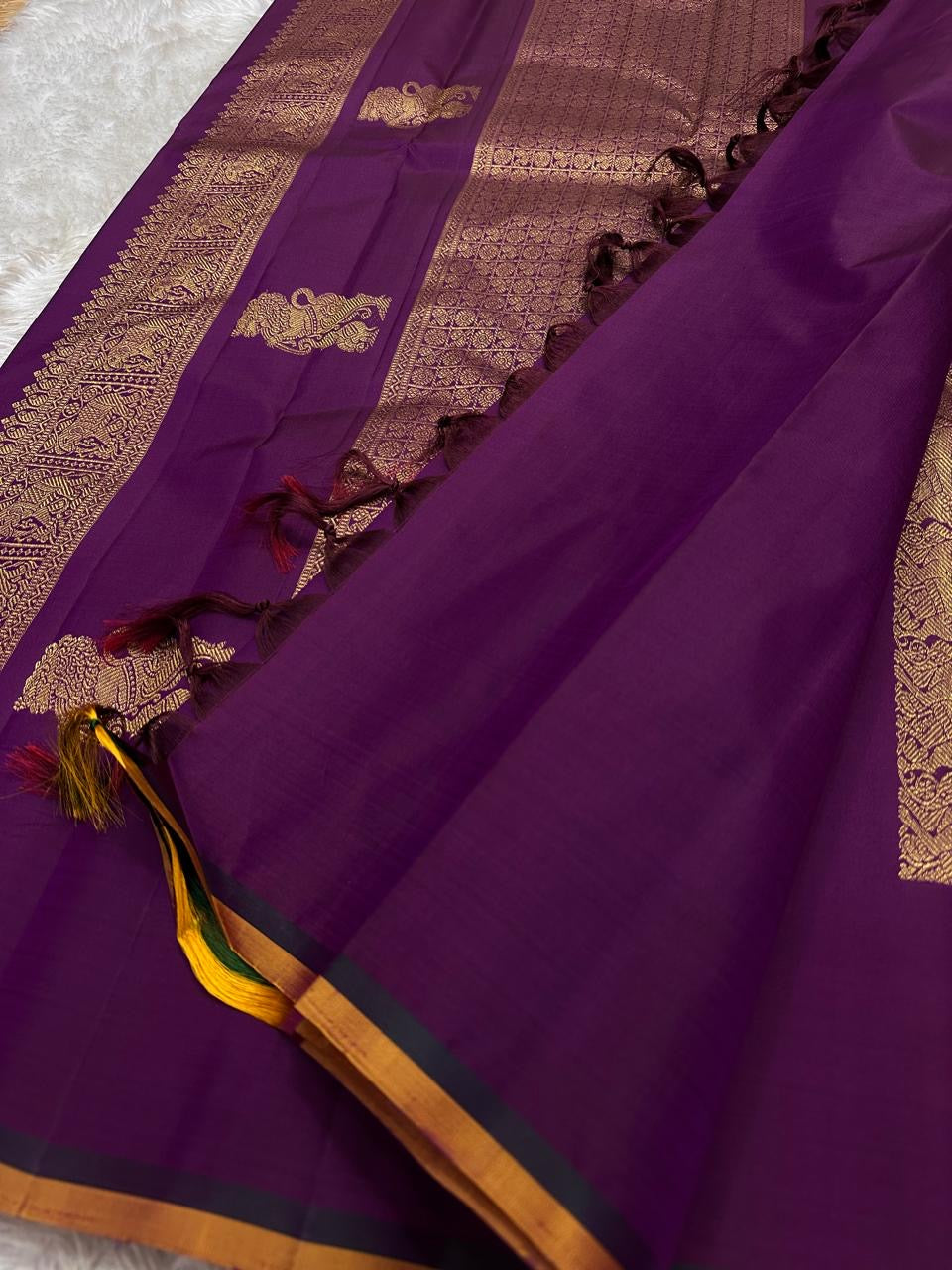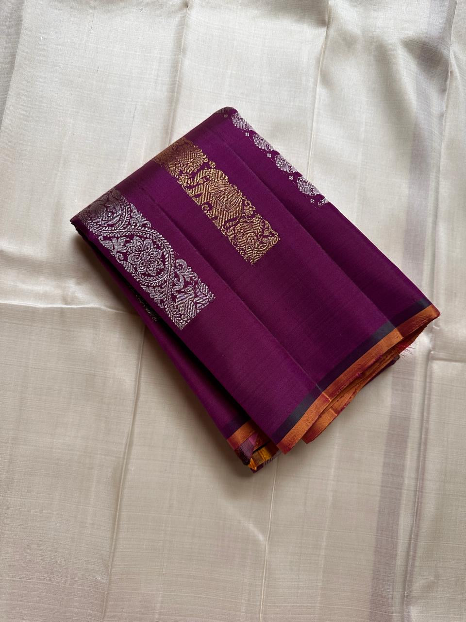 The dual-tone pink and green double selvedge adds a striking edge to the saree, enhancing its visual richness while showcasing classic South Indian weaving artistry. The interplay of metallic zari over the vibrant purple silk body lends a sophisticated gleam, making it a standout piece for grand occasions.