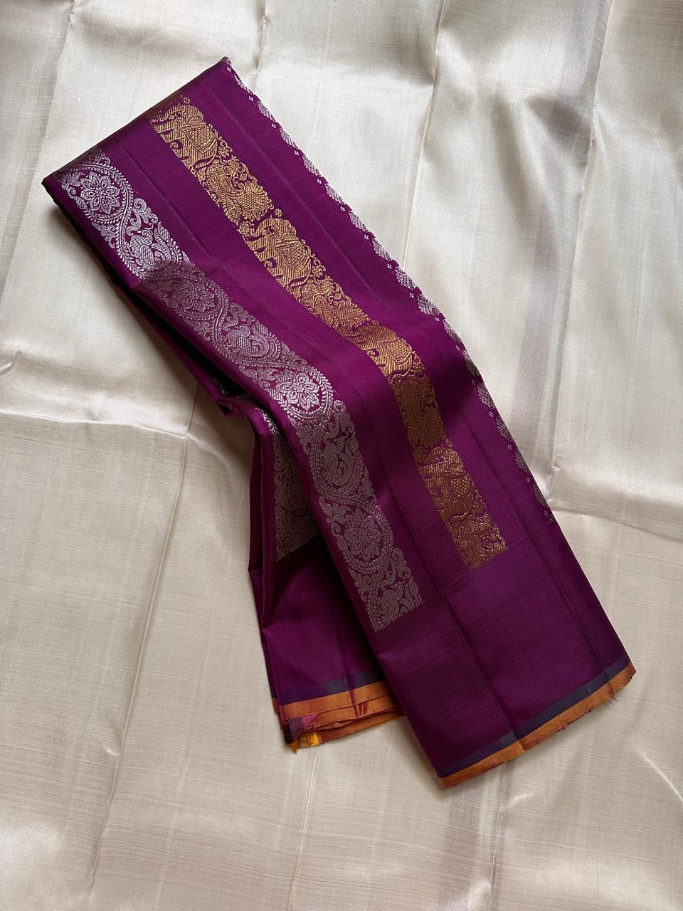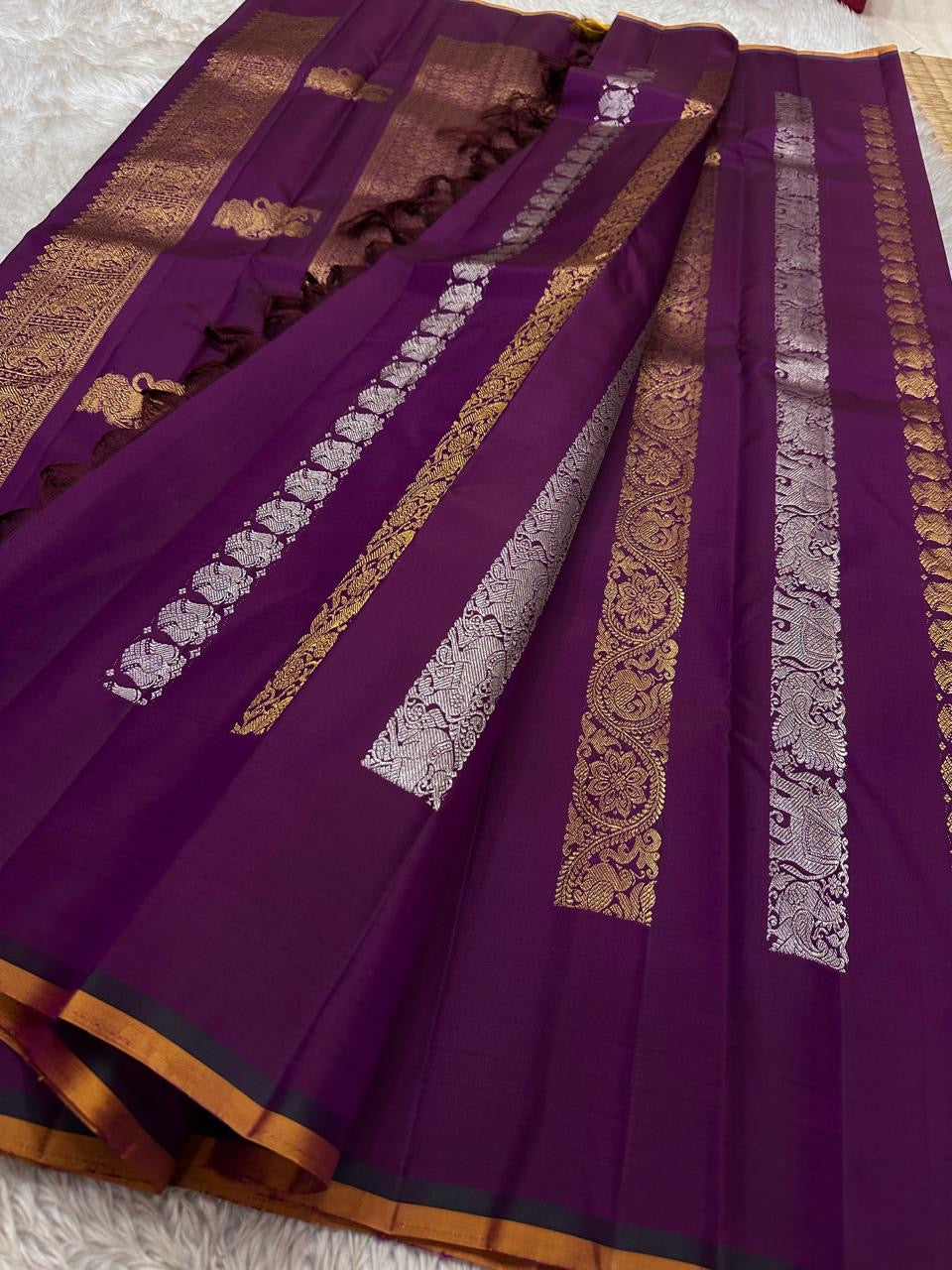 Lavanya– radiant purple Handwoven Kanchipuram Silk Saree in purple with Gold & Silver Zari, this deep purple Kanchipuram silk saree with intricate motifs in gold and silver zari, including Gandaberunda, parrots, elephants &lotuses as seen on Nita Ambani