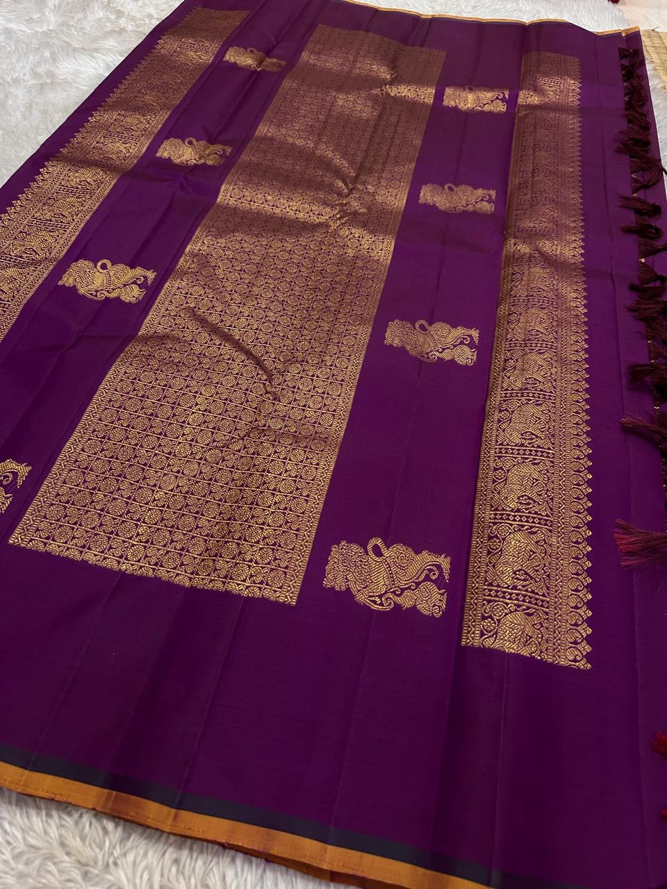 Inspired by timeless heritage and woven to perfection, this exquisite Kanchipuram silk saree is a regal tapestry of tradition. Set against a lustrous radiant purple silk base, it features an array of intricate handwoven motifs in radiant gold and silver zari—rows of Gandaberunda, parrots, elephants, kamalam (lotus), paisleys, and floral vines—each symbolizing power, beauty, and prosperity.