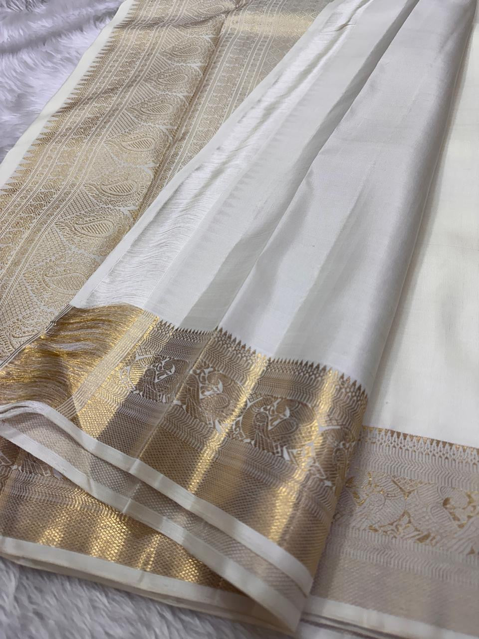 Pearl Radiance ✨ – Pure Kanchipuram Silk Saree Ivory Body with Gold Zari Buttas & Medallions Traditional Yali & Peacock Motif Zari Border Grand Zari Pallu with Paisleys & Floral Vines Silk Mark Certified | Free USA Shipping