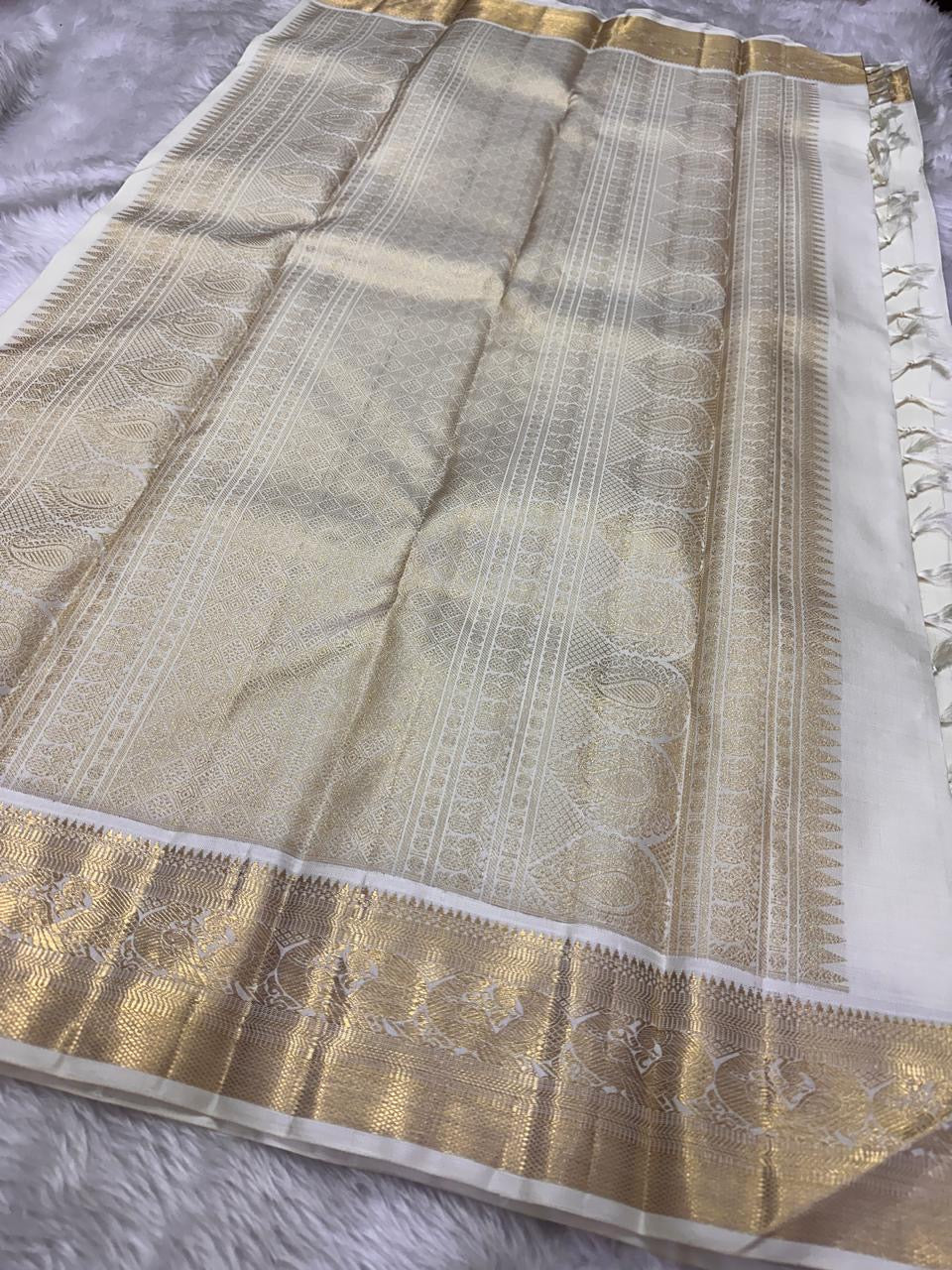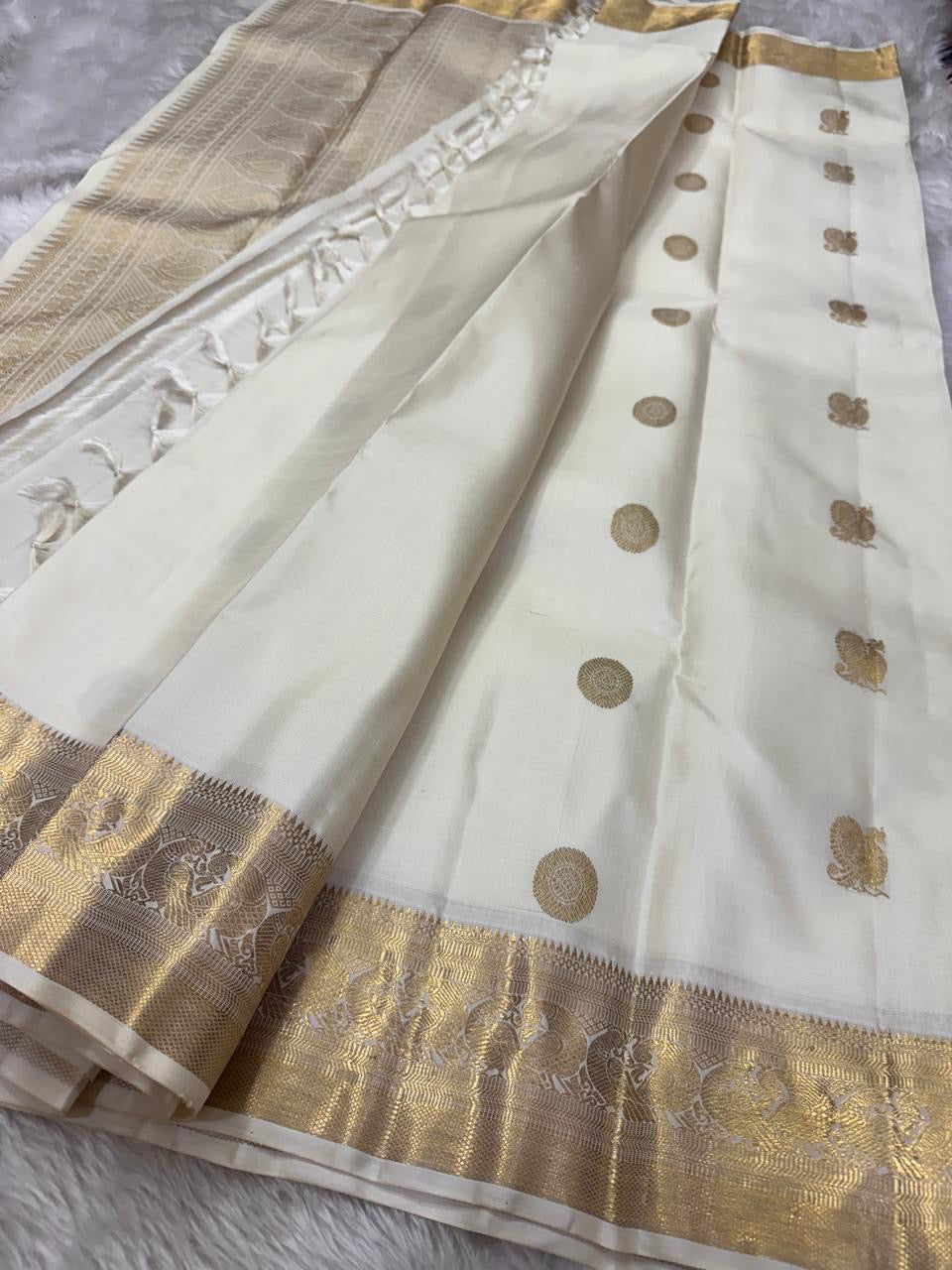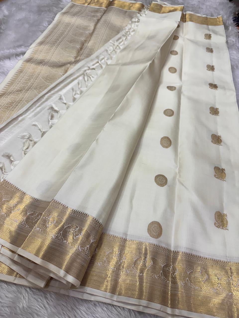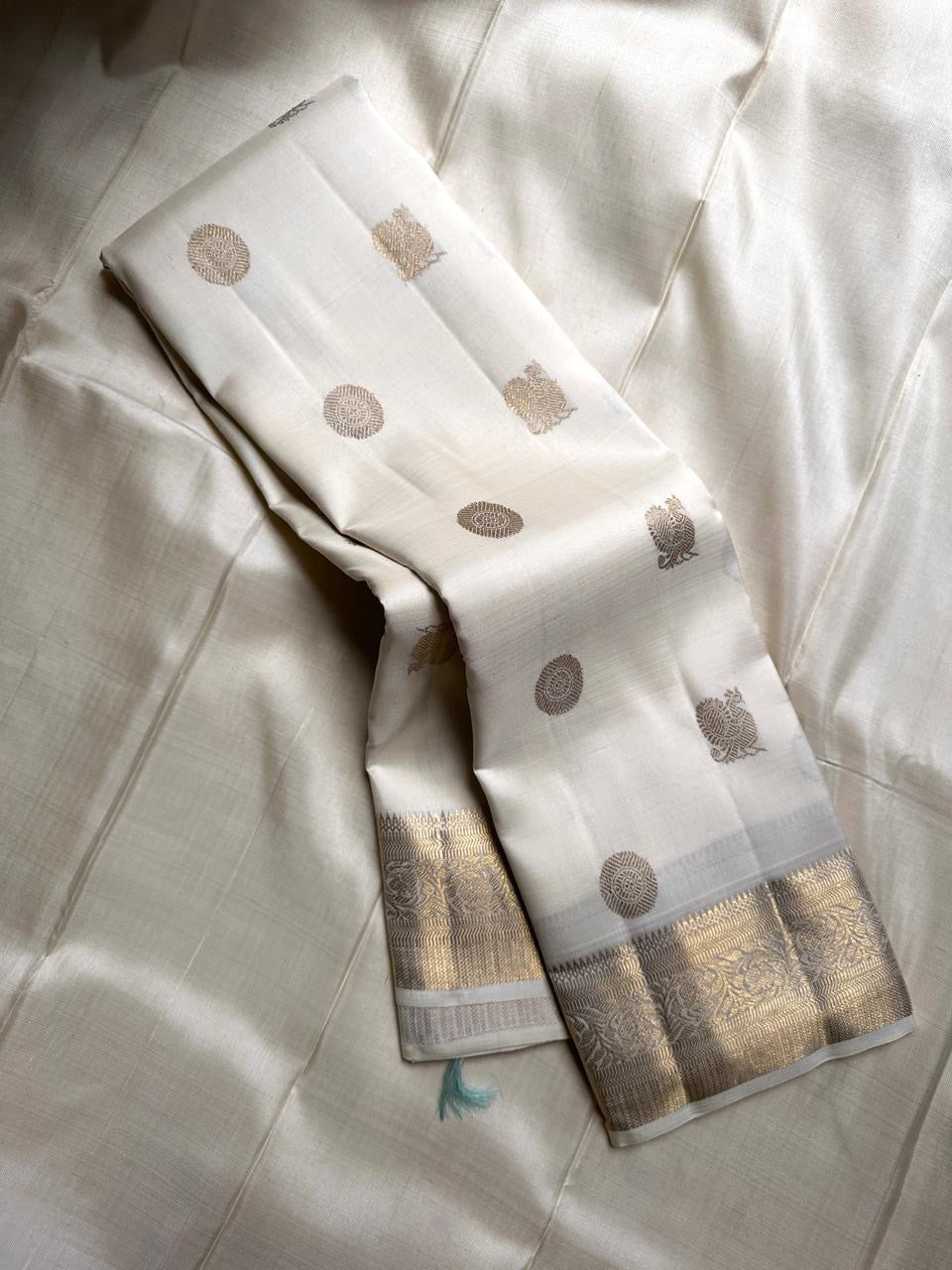 Pearl Radiance ✨ – Pure Kanchipuram Silk Saree in Ivory with Gold Zari Buttas & Grand Pallu