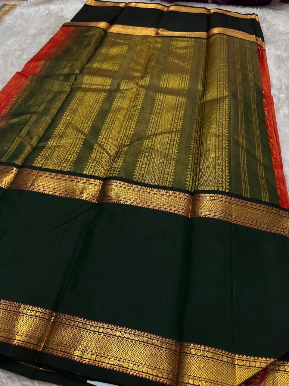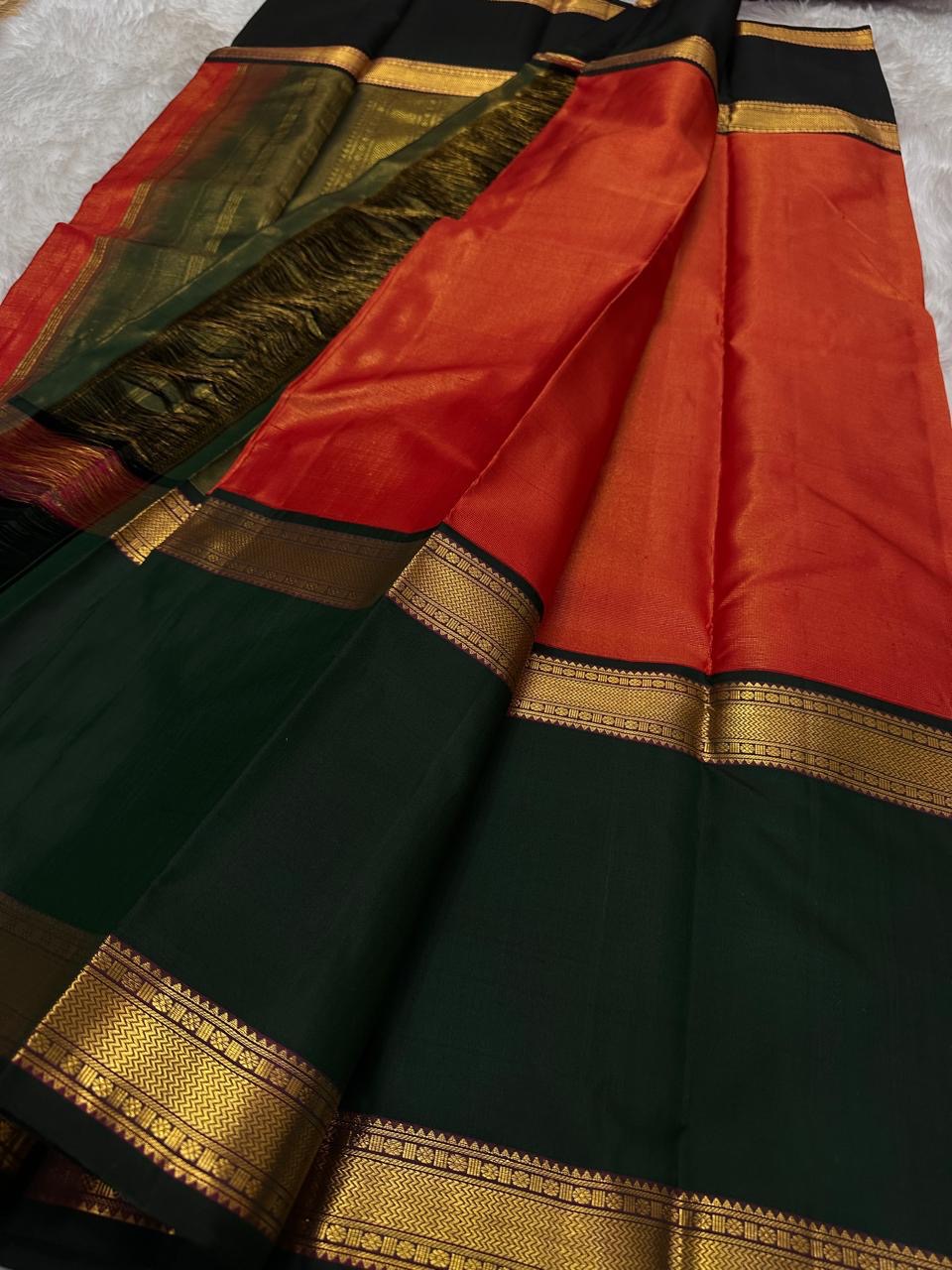 #FestiveSaree #AuspiciousDrape #VairaoosiWeave #OrangeSilkSaree #BottleGreenBorder #SouthIndianElegance #IdamLiving #SareeOfTheDay #SilkSareeLove #TraditionalWeaves #vairaoosi