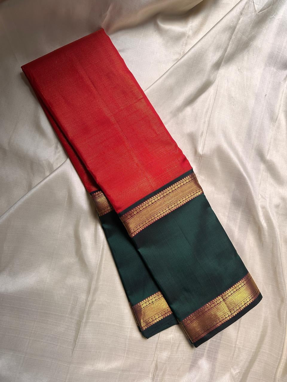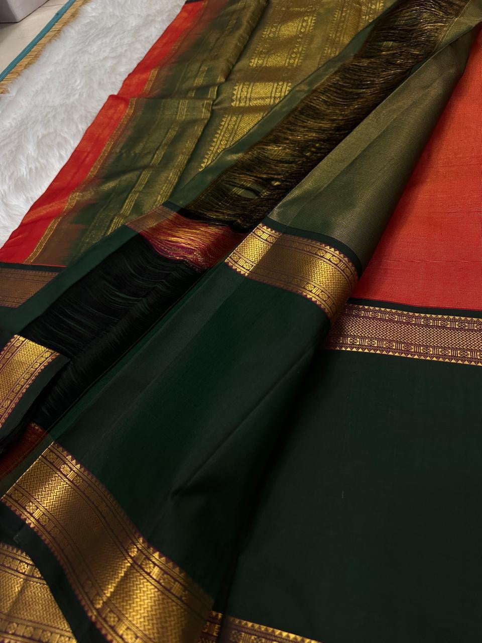 A festive radiant orange silk saree with a rich vairaoosi all over bottle green border, woven to celebrate tradition with a bold flair.