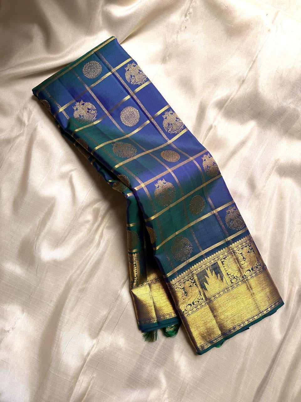 A celestial blend of blue and green, this Kanjivaram silk saree ,adorned with Gandaberunda and Kamalam buttas, golden checks, and a majestic thazhampoo Mayil border.🦚