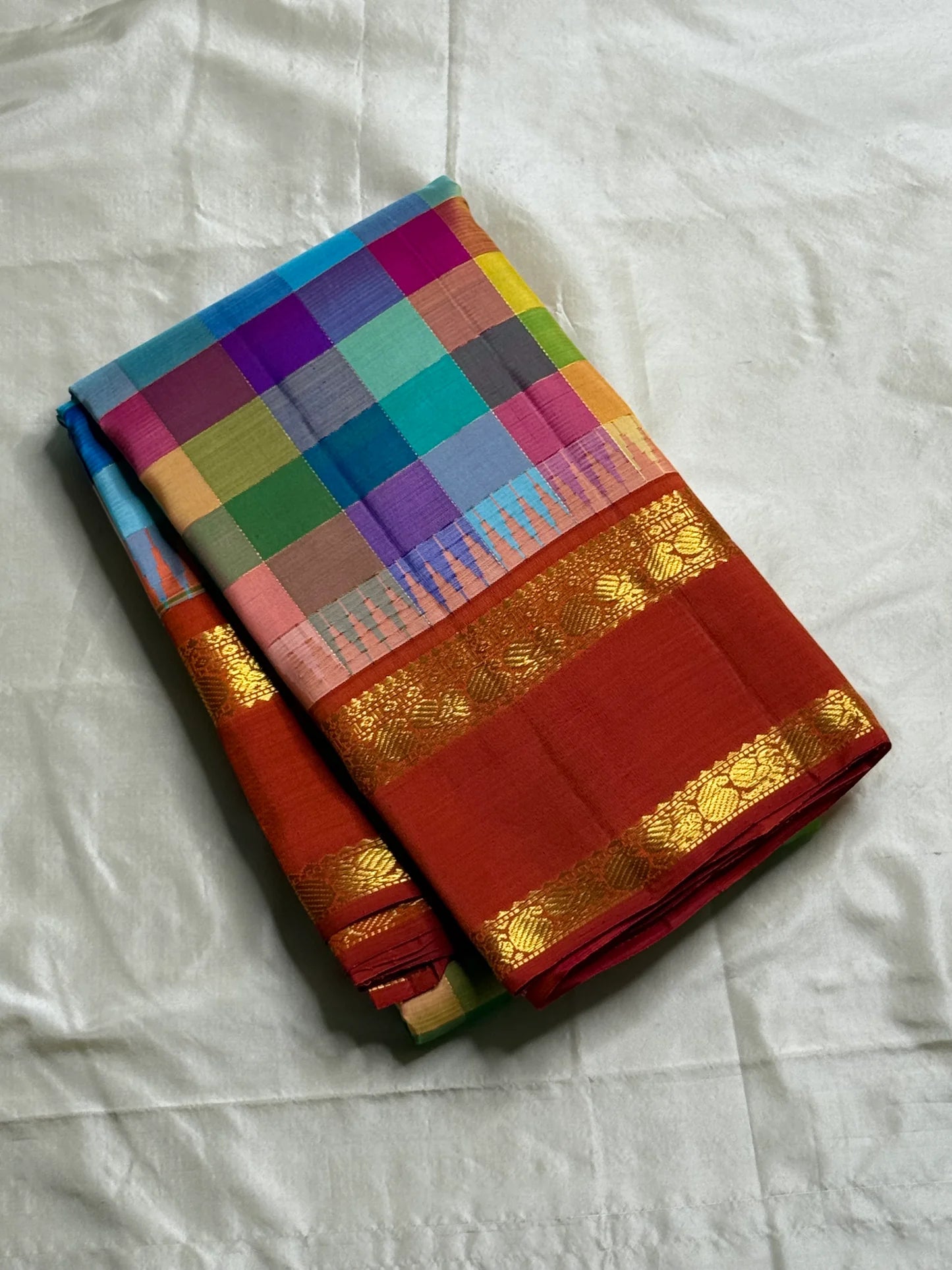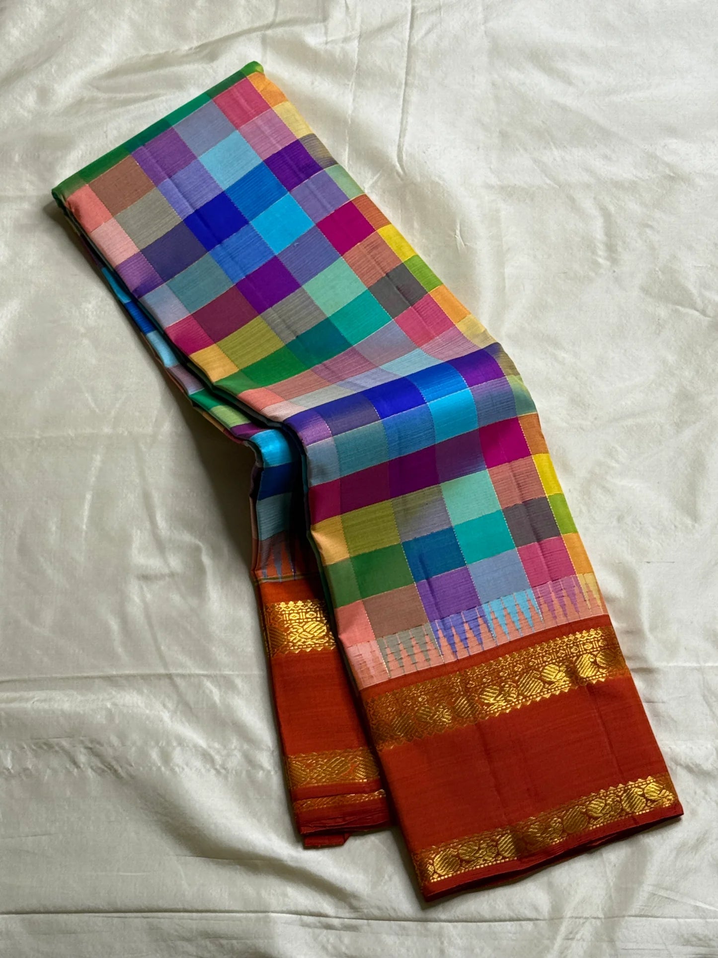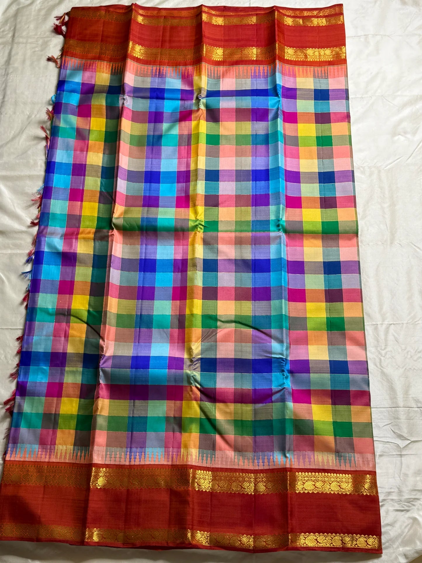 Ratna Mala ✨ – Pure Kanchipuram Silk Saree with Multicolor Checks & Red Zari Border