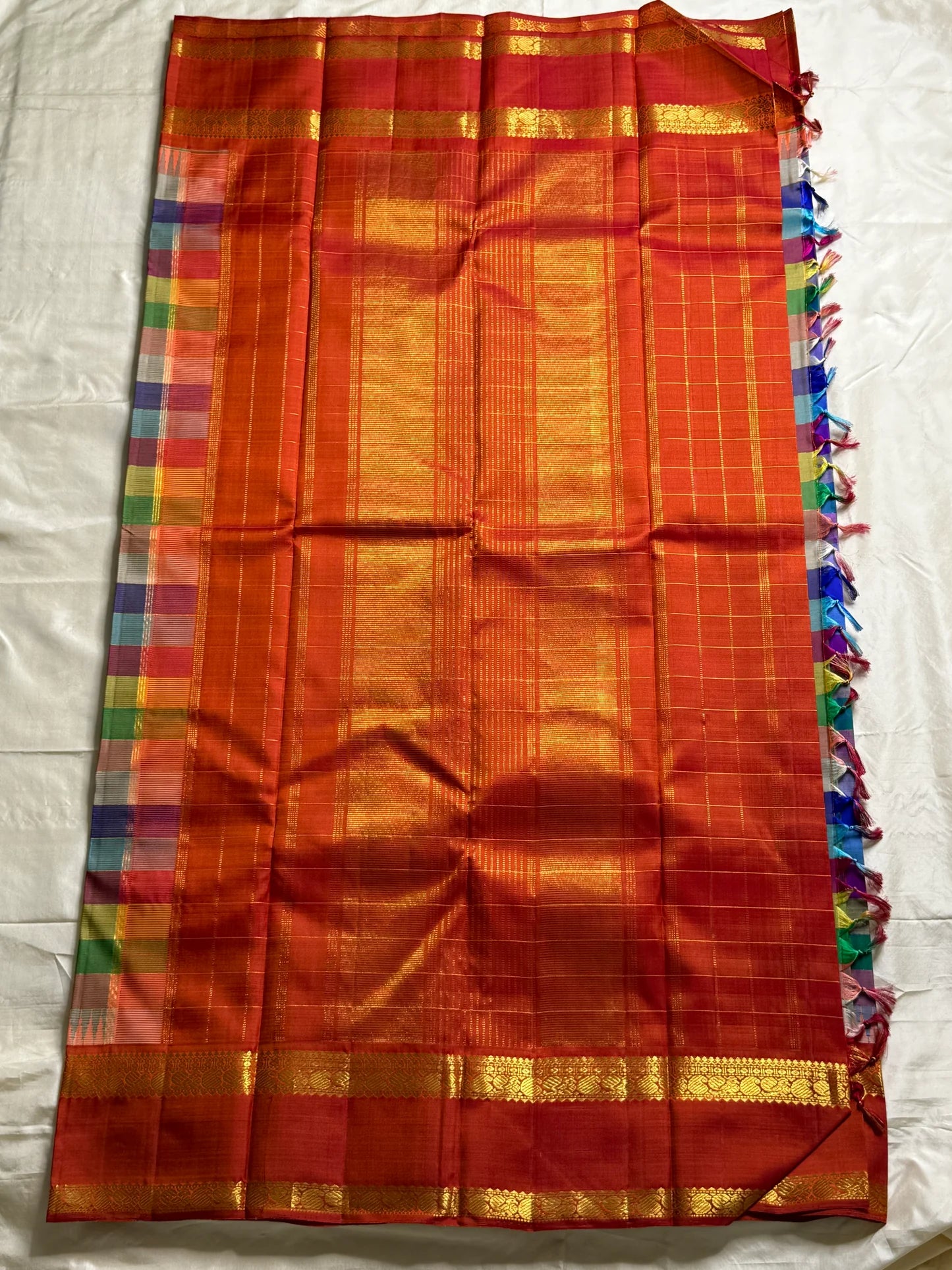 View compareRatna Mala ✨ – Pure Kanchipuram Silk Saree Multicolor Checked Body in Vibrant Jewel Tones Deep Red Korvai Border with Gold Zari Weaving Grand Red 2gm Zari Brocade Pallu with Traditional Motifs