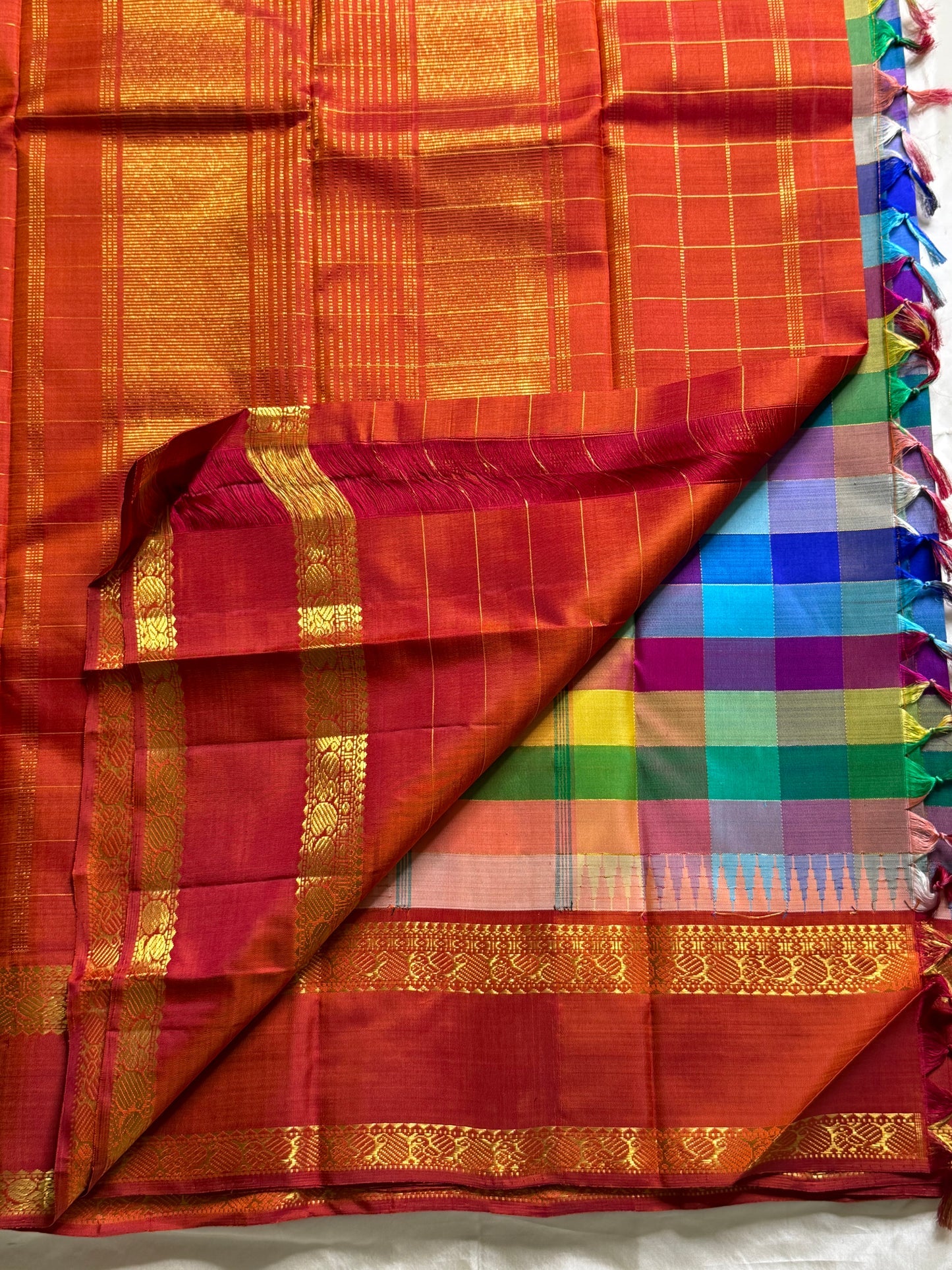 Ratna Mala ✨ – Pure Kanchipuram Silk Saree Multicolor Checked Body in Vibrant Jewel Tones Deep Red Korvai Border with Gold Zari Weaving Grand Red 2gm Zari Brocade Pallu with Traditional Motifs
