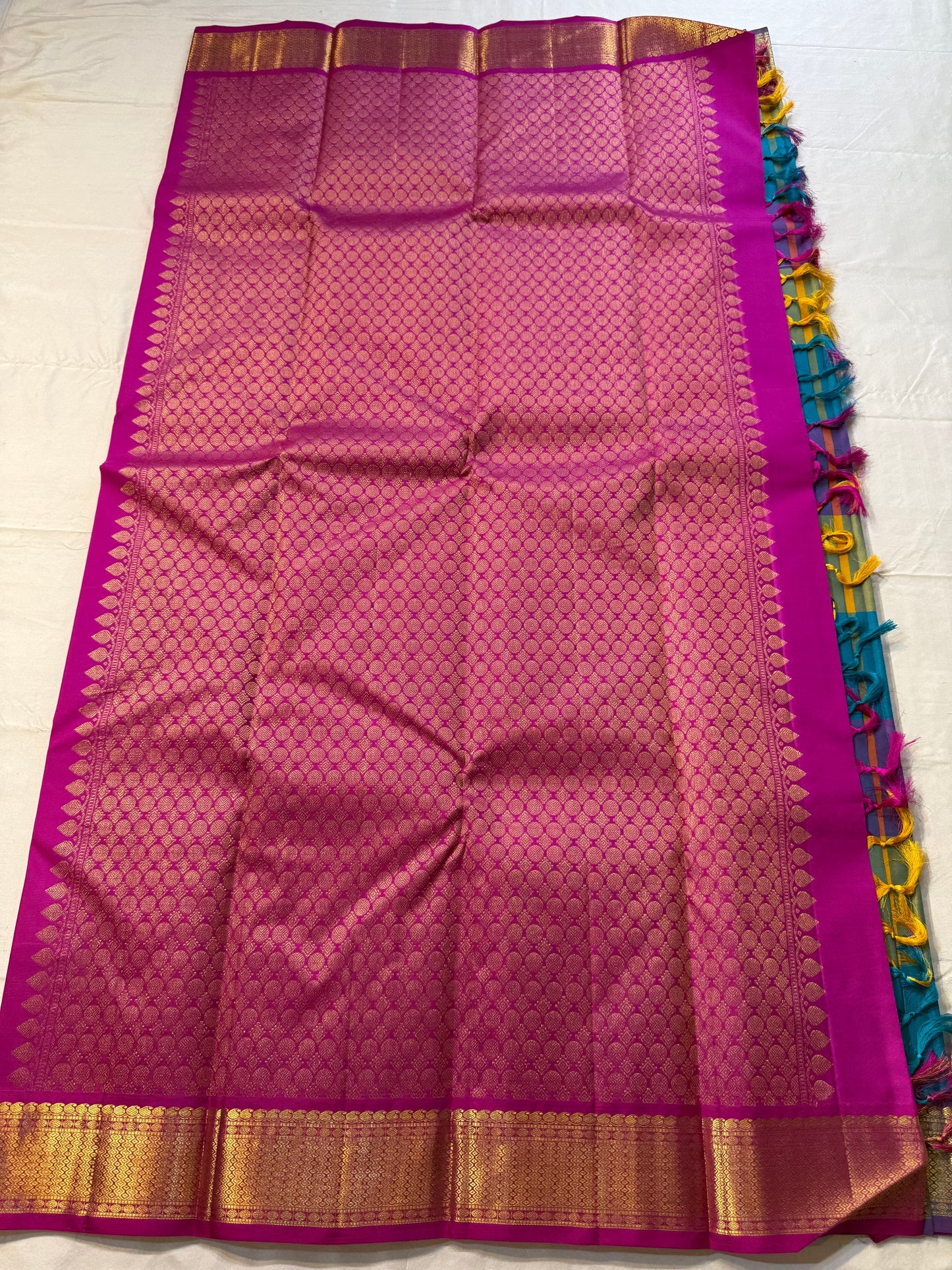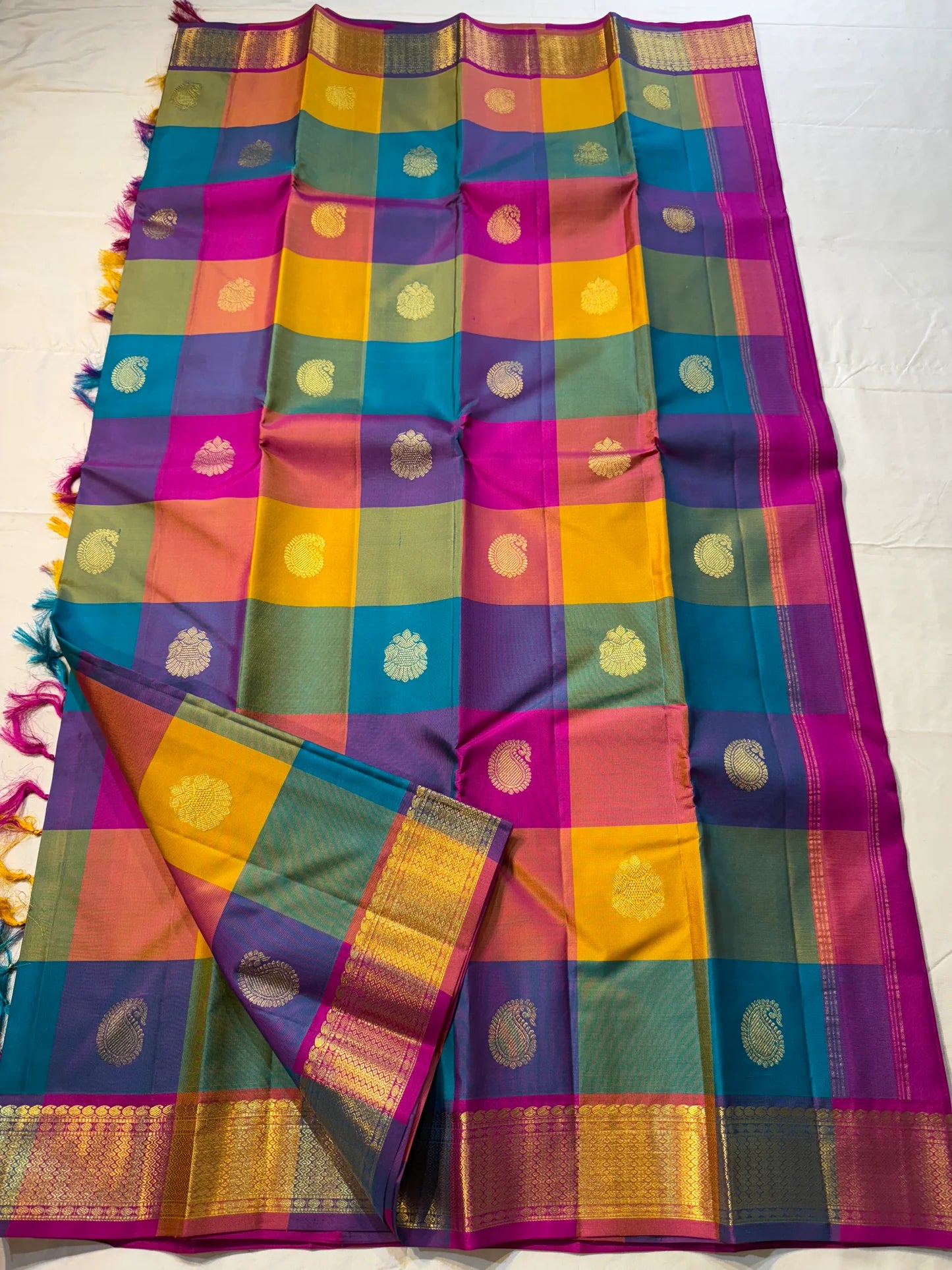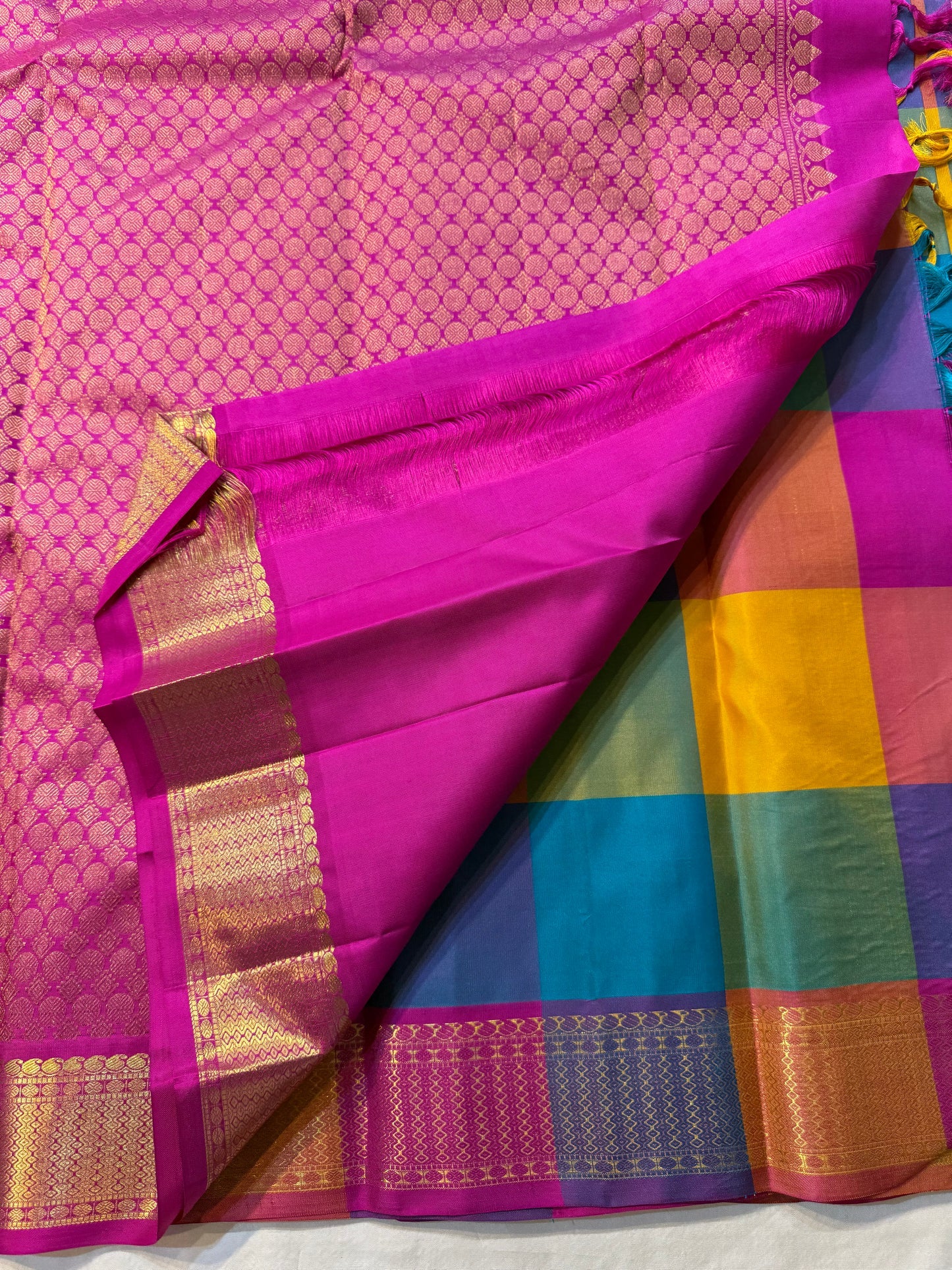 Rangoli Kattam – Pure Silk Kanchipuram Saree Vibrant multicolor kattam checks with golden zari buttas across the body Rich rani pink pallu with intricate zari weaving for a grand finish Contrast purple borders edged with gleaming zari motifs