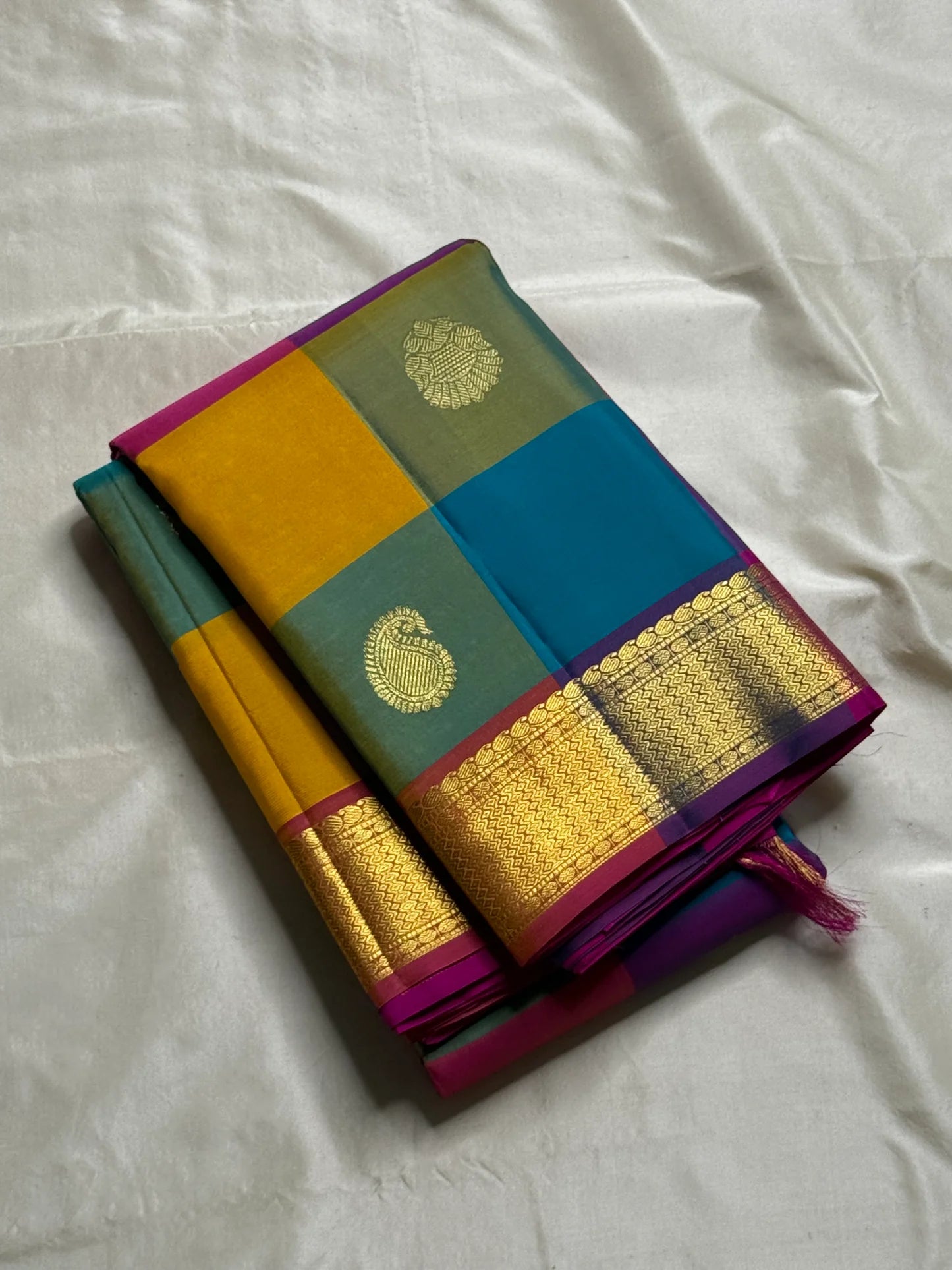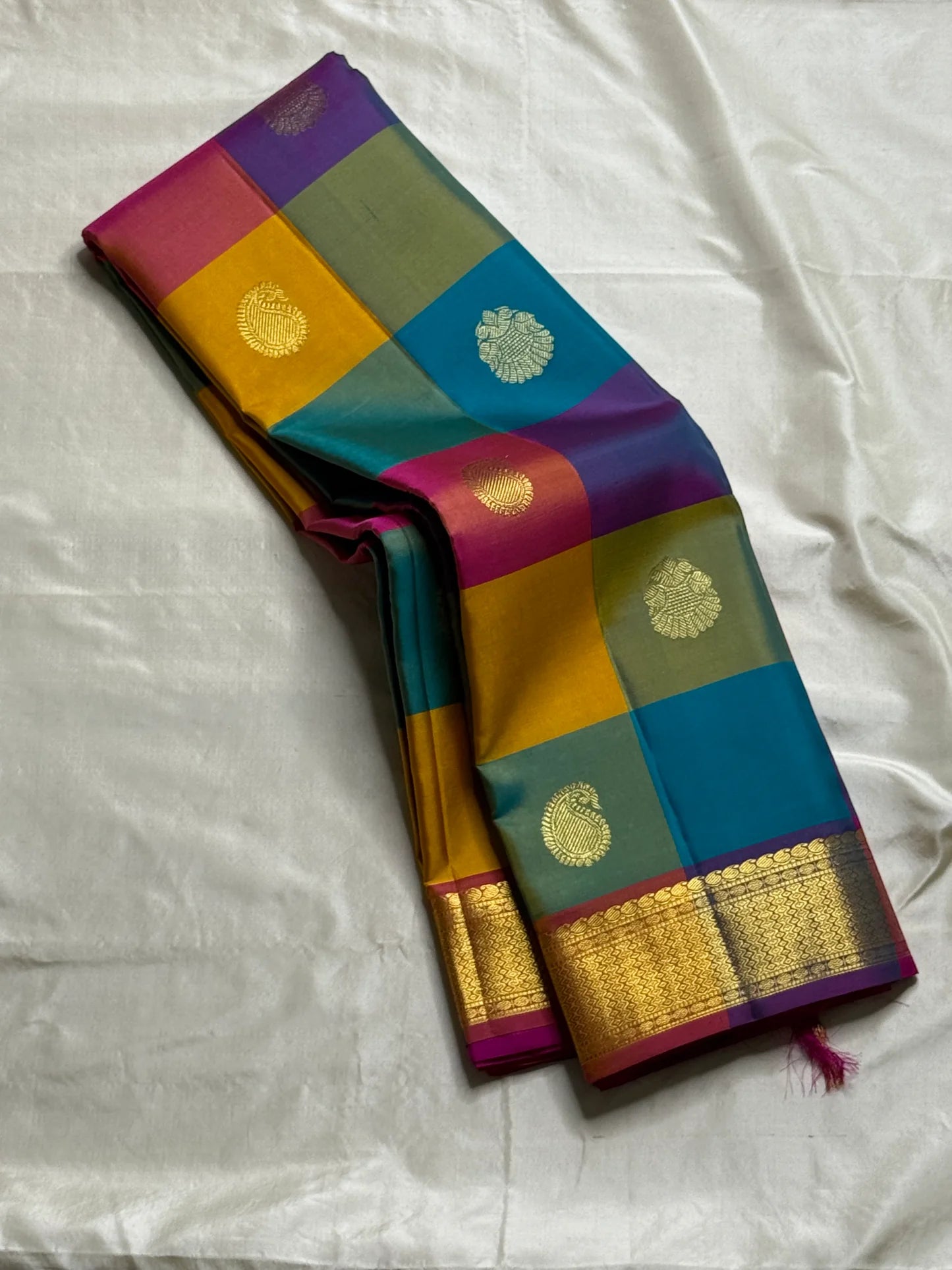 A joyfully traditional Kanchipuram woven in bold multi-colour kattam (checks). Squares of peacock teal, haldi mustard, olive green, royal purple and fuchsia dance across the body, each check dotted with alternating gold zari paisley (mango) and floral medallion buttas. Finished with a contrast rani-pink border in rich gold zari and a statement rani-pink pallu drenched in intricate all-over circular zari jaal.
