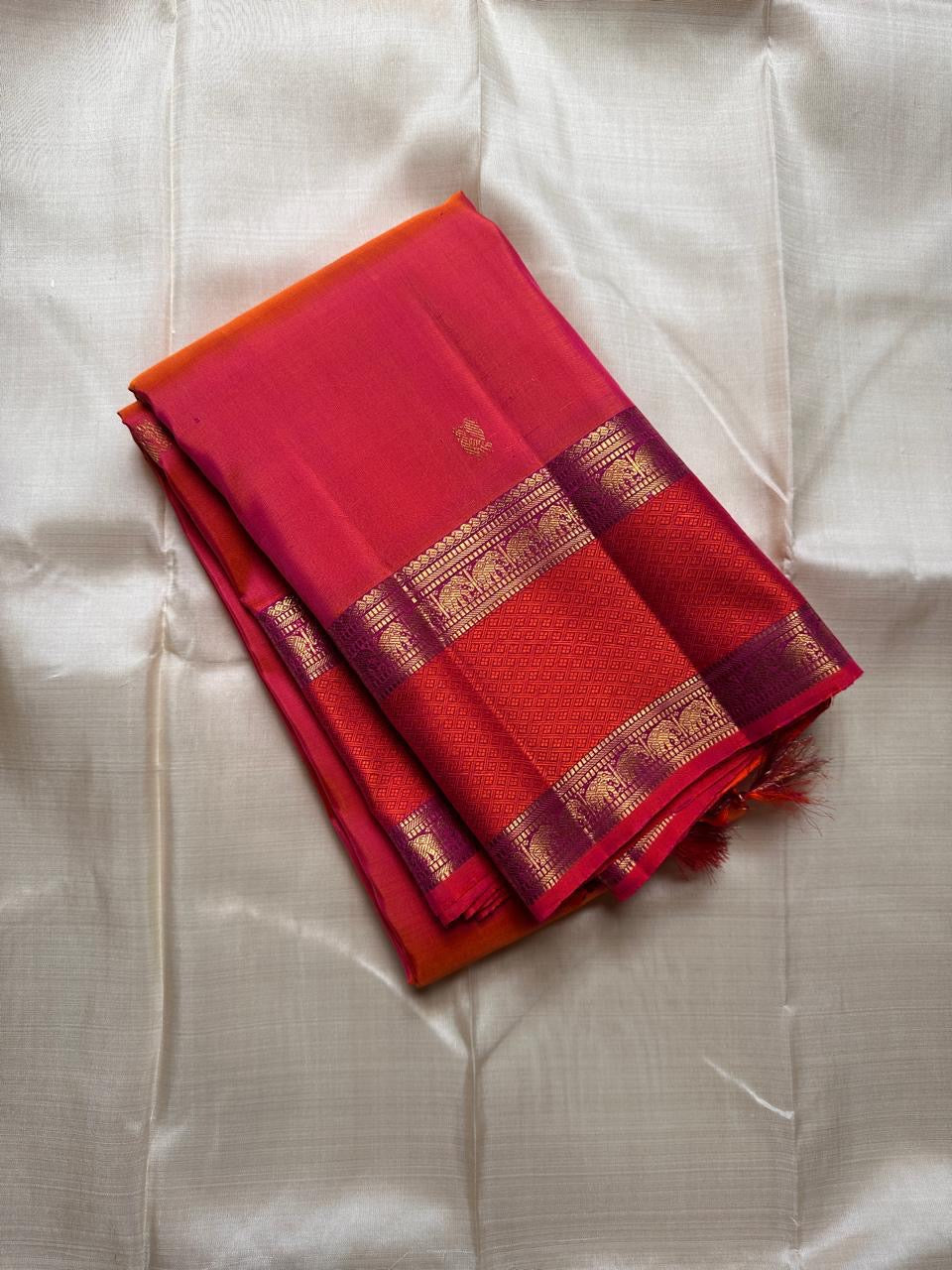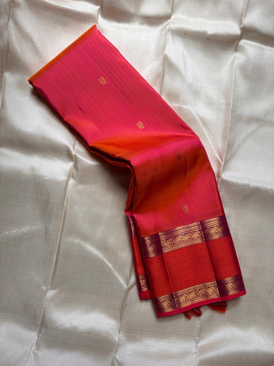 • Radiant aruna–pink-orange dual-tone body with zari buttas 🌸