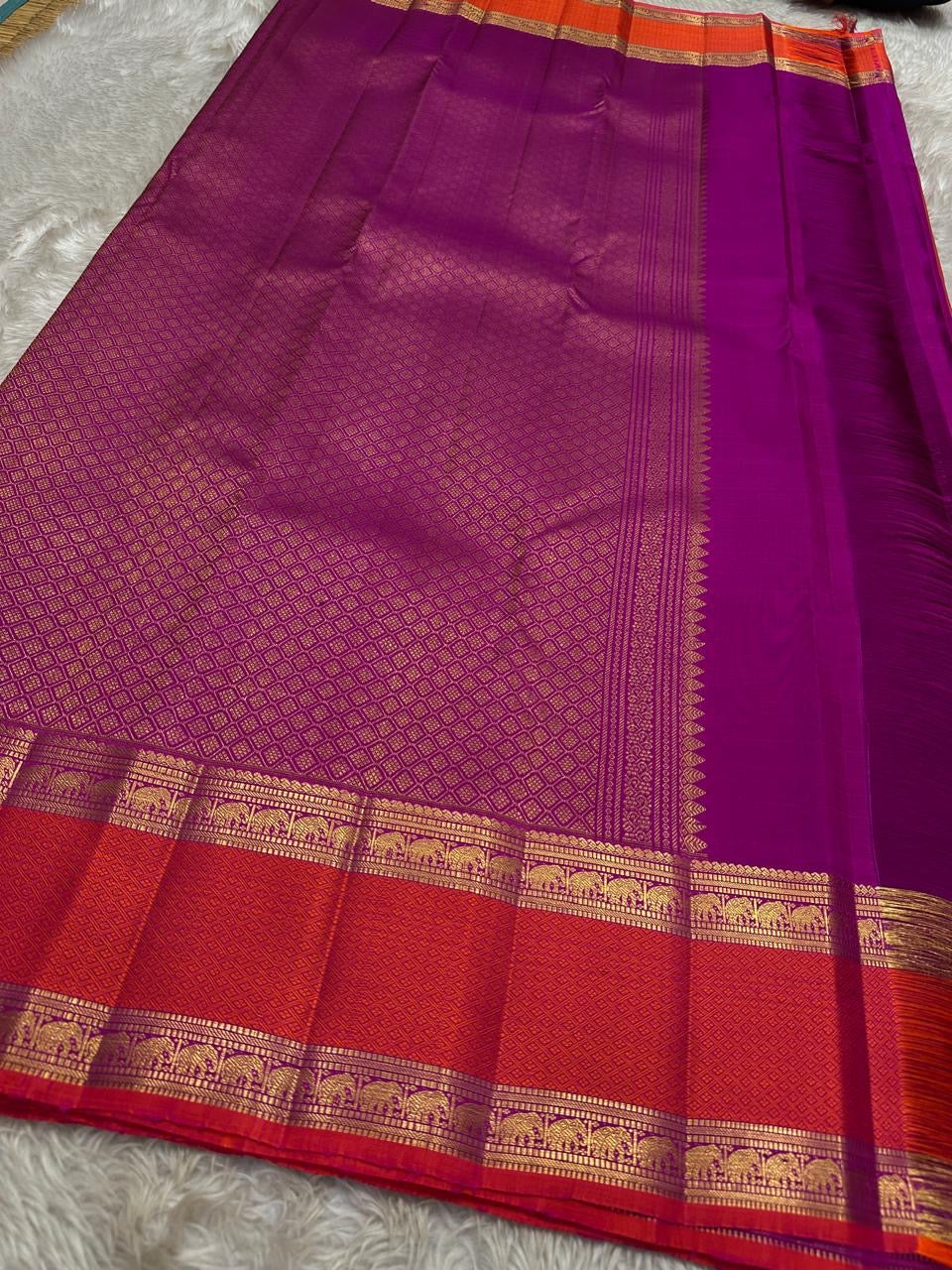 • Pallu: Contrast violet with fine diamond jaal brocade.