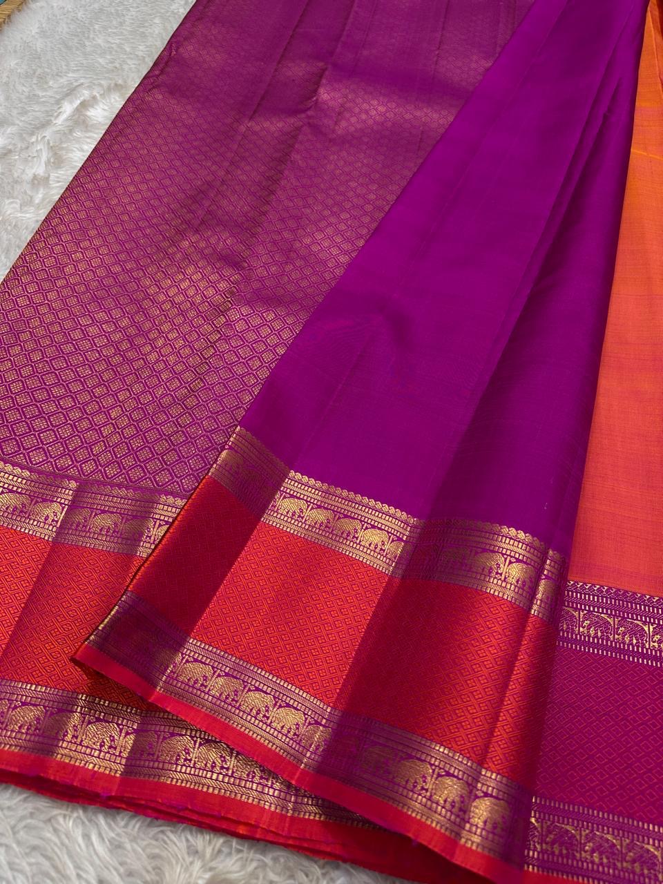 Kumudham — Pure Silk Kanchipuram Saree Aruna-pink shot orange body • Maroon gopura temple borders • Violet diamond brocade pallu ✨ Silk Mark Certified • Free USA Shipping • Ships in Two Weeks ✅