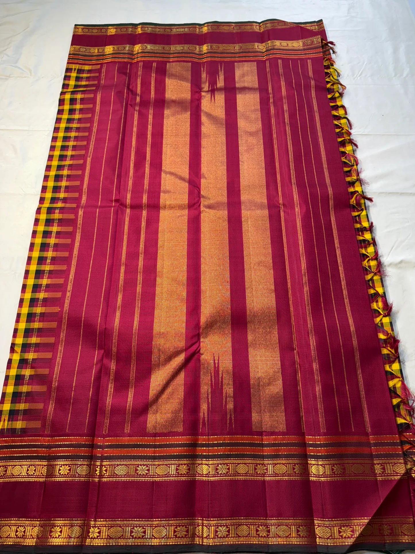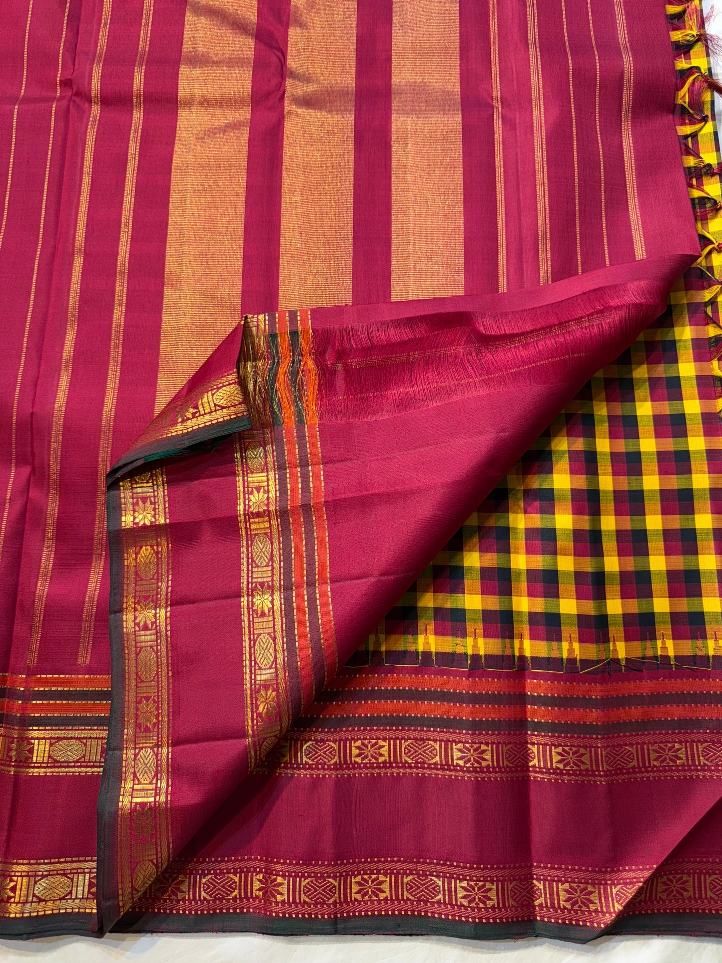 Manjal Maroon Kattam – Pure Kanchipuram Silk Saree Mustard & Maroon Body with Traditional Multi-Color Checks Korvai Borders with Floral-Star Zari & Temple Tips Grand Maroon Pallu with Gold Zari Stripes & Tassels Silk Mark Certified | ships in 2 weeks