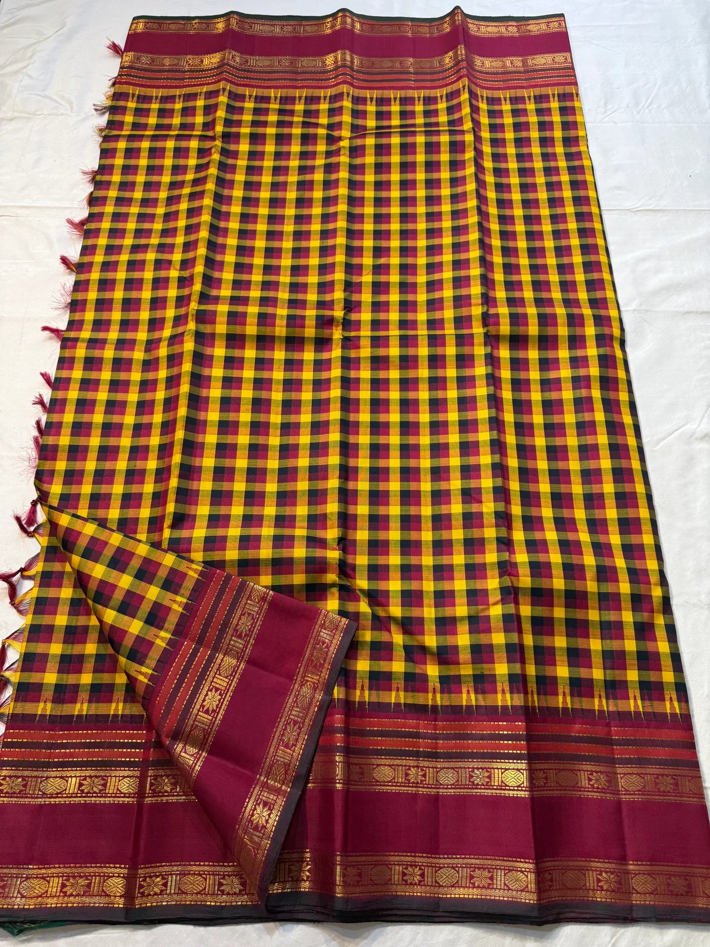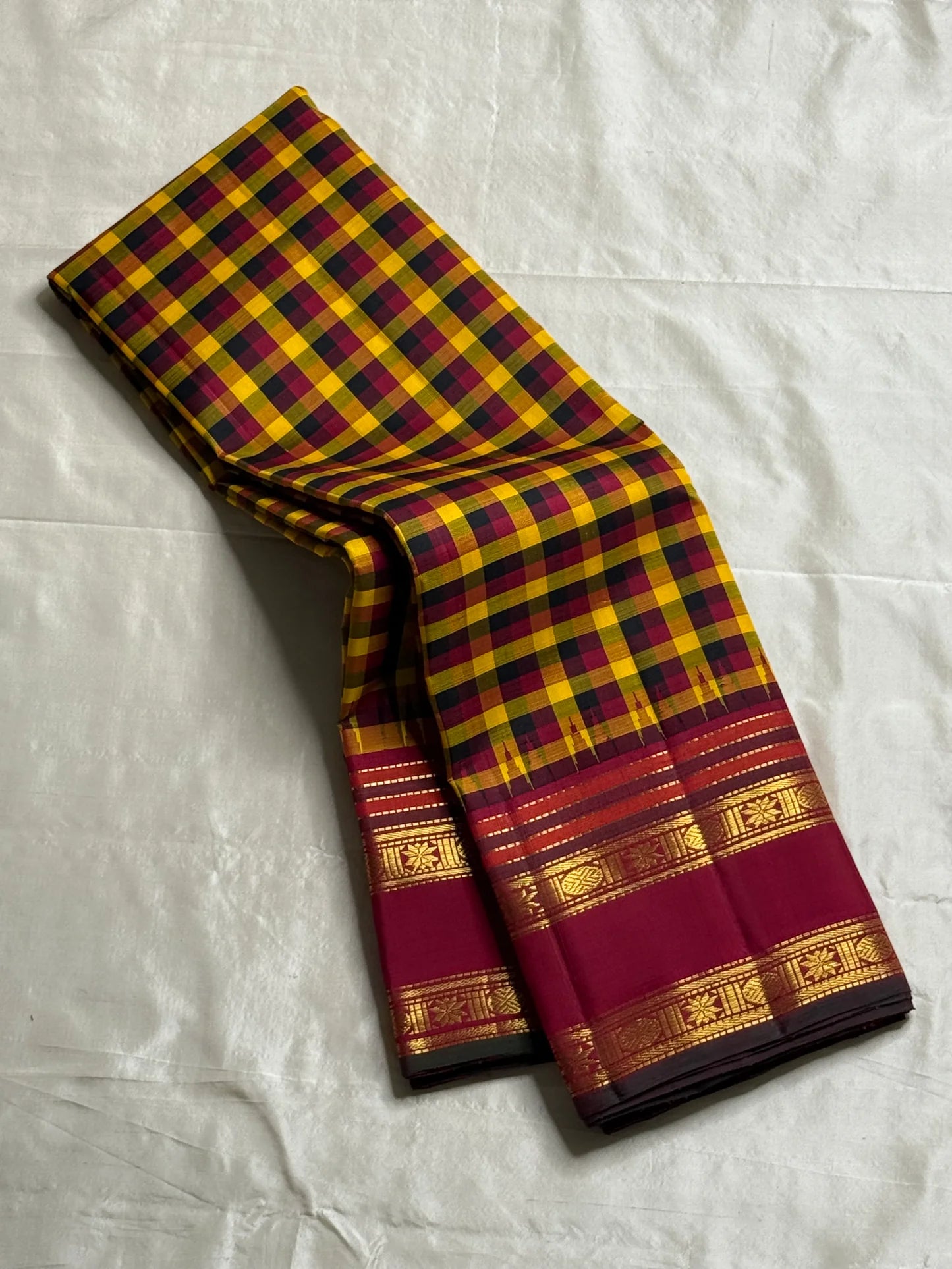 Pure Kanchipuram Silk Saree – Mustard & Maroon Checkered Body with Korvai Borders