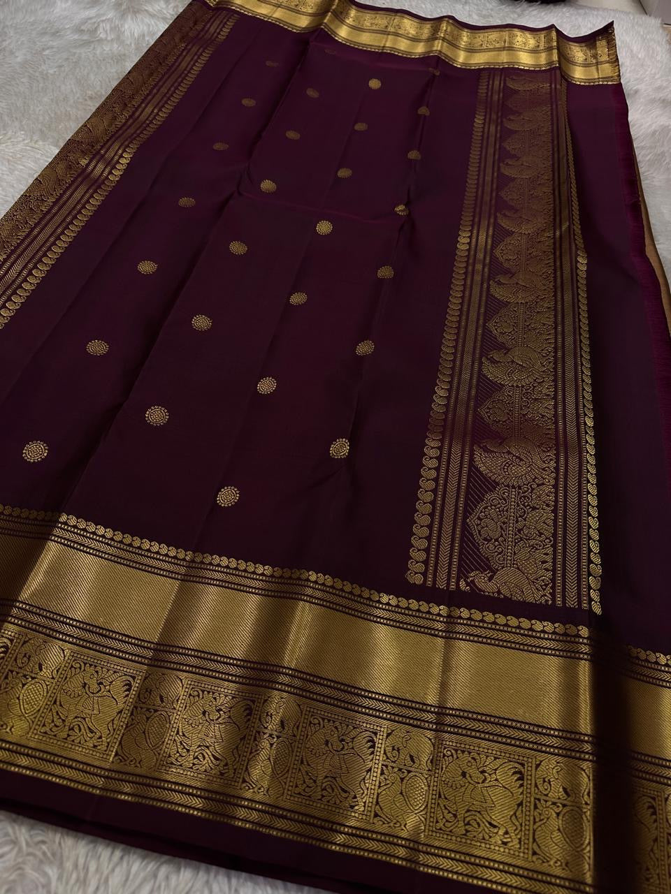 - Border: rich deep brown korvai with grand antique-gold zari—chakram coin medallions, annam/yali panels and intricate diamond mesh.