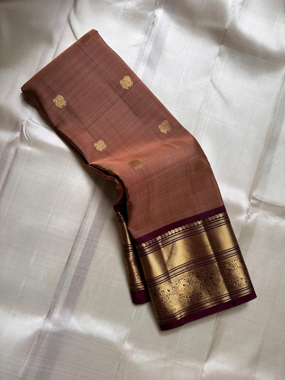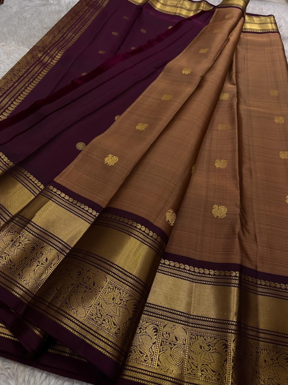 Biscuit Brown Glow – Korvai Kanchipuram Pure Silk Saree Biscuit-brown (rust shot) body with gold chakram & paisley buttas Rich deep-brown korvai border with annam medallions & diamond mesh Grand deep-brown zari pallu |… read description