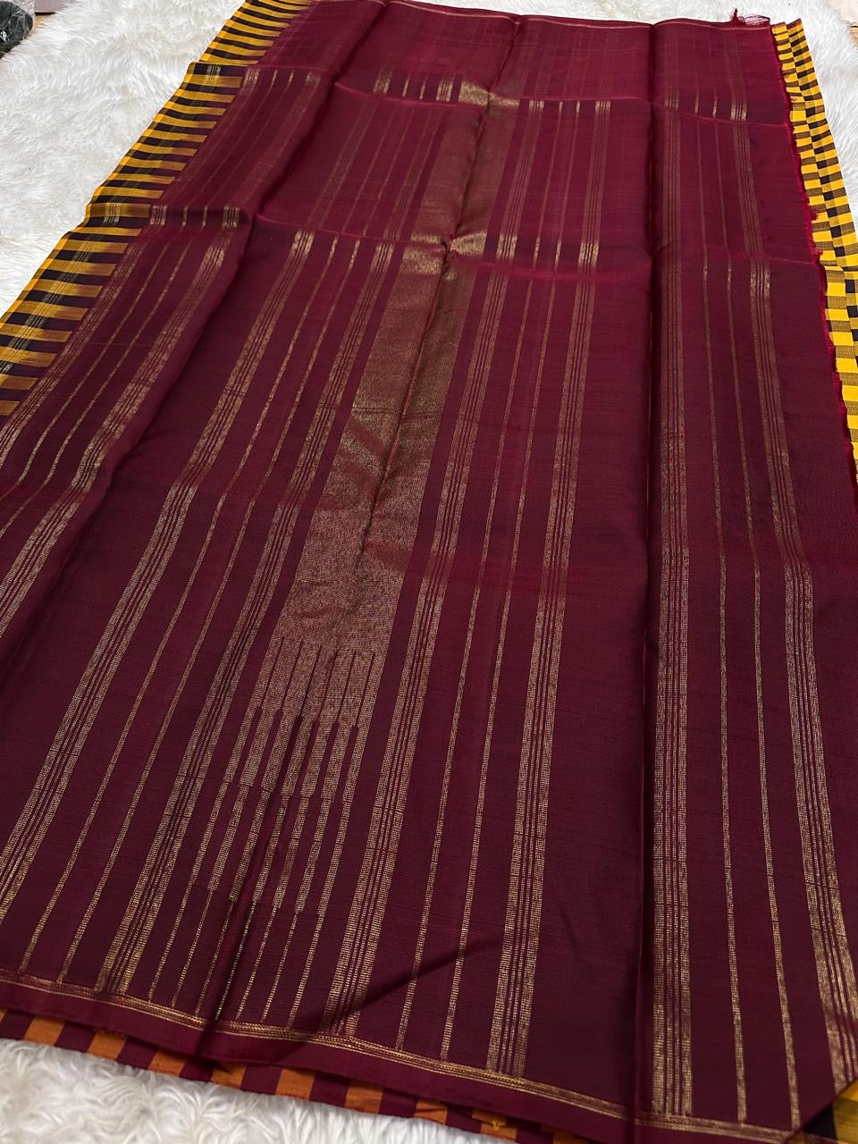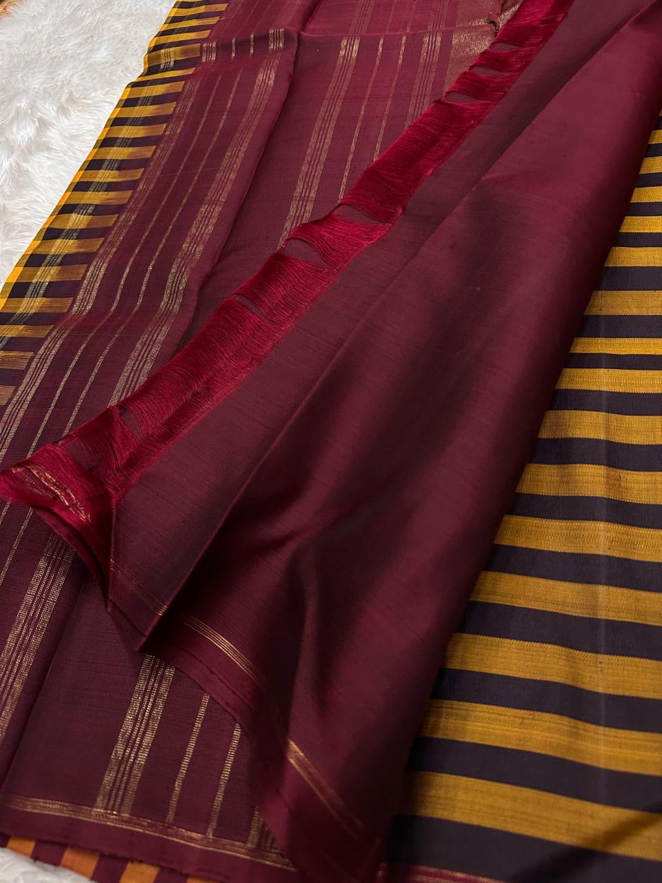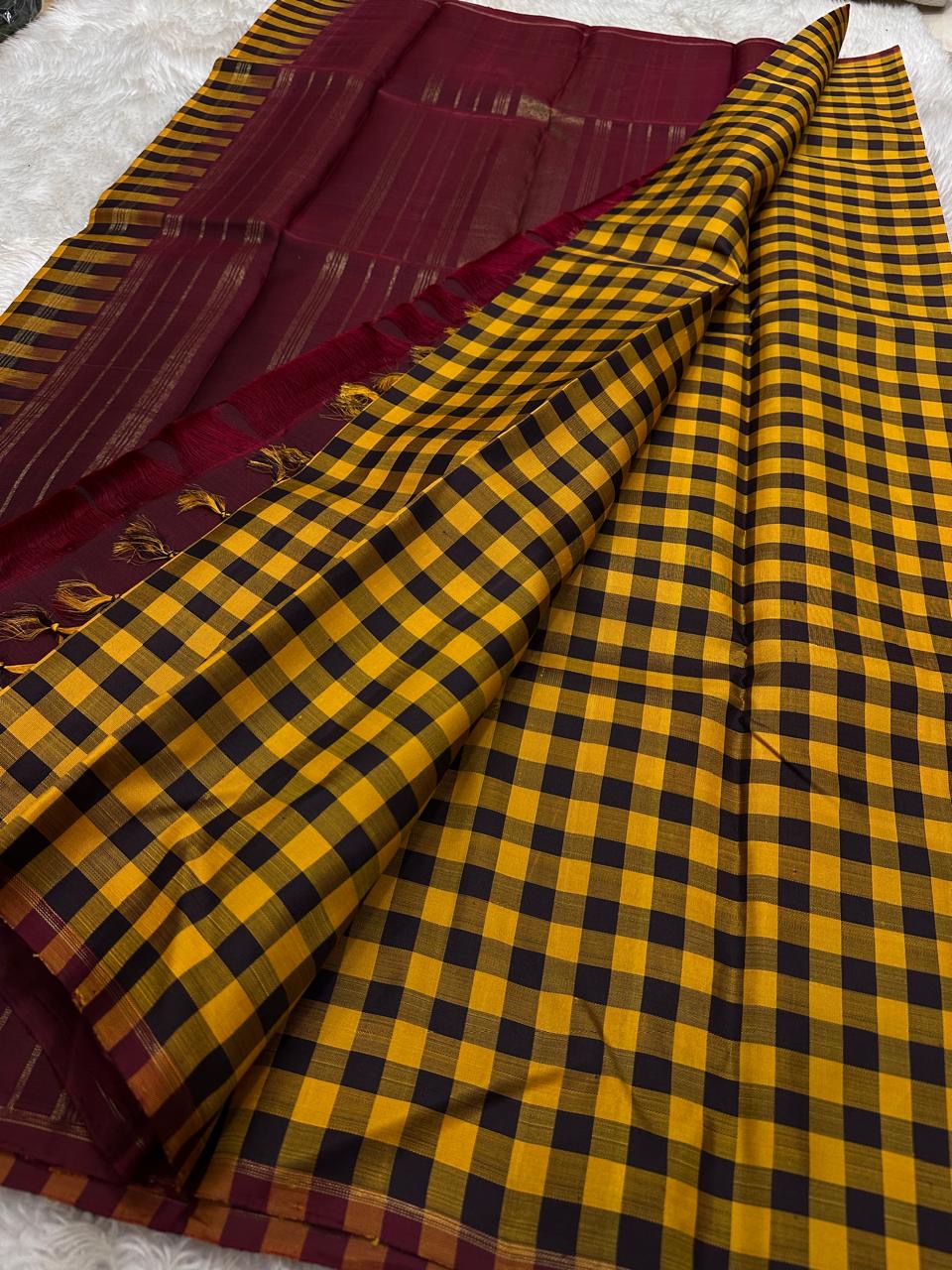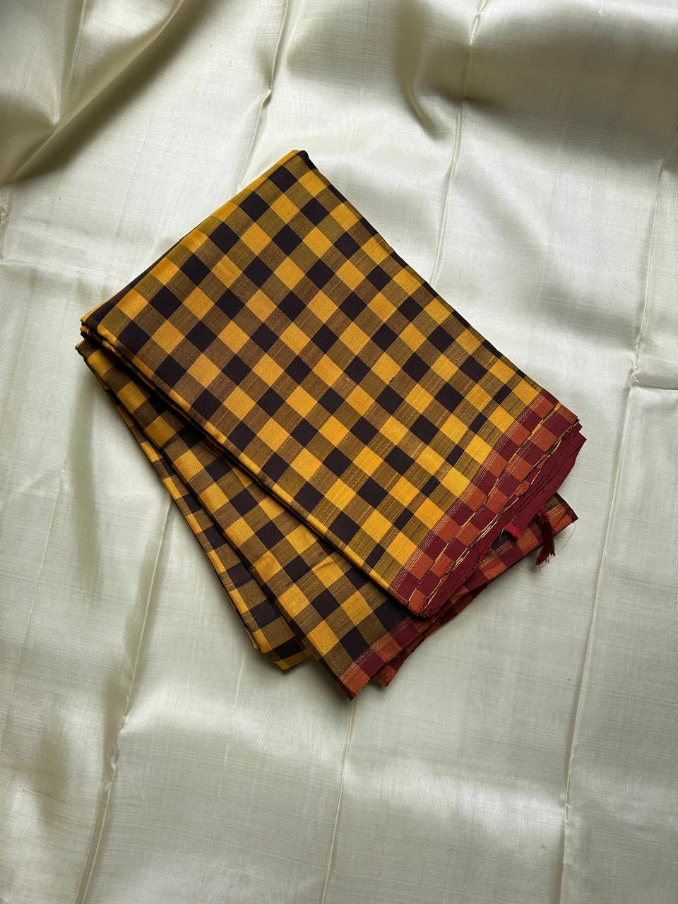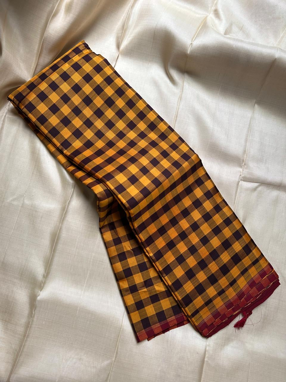 Kanchi kattam mustard and brown checked saree with deep maroon Pallu, Kai korvai