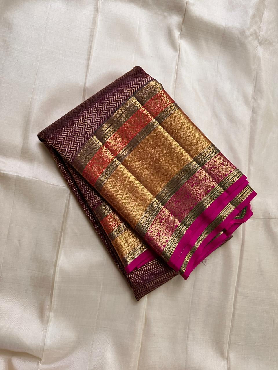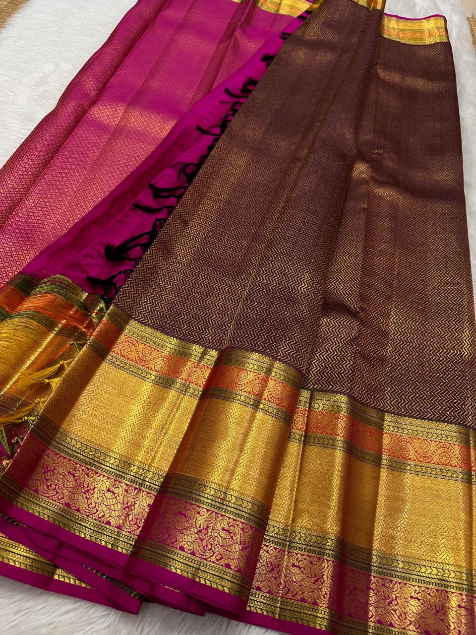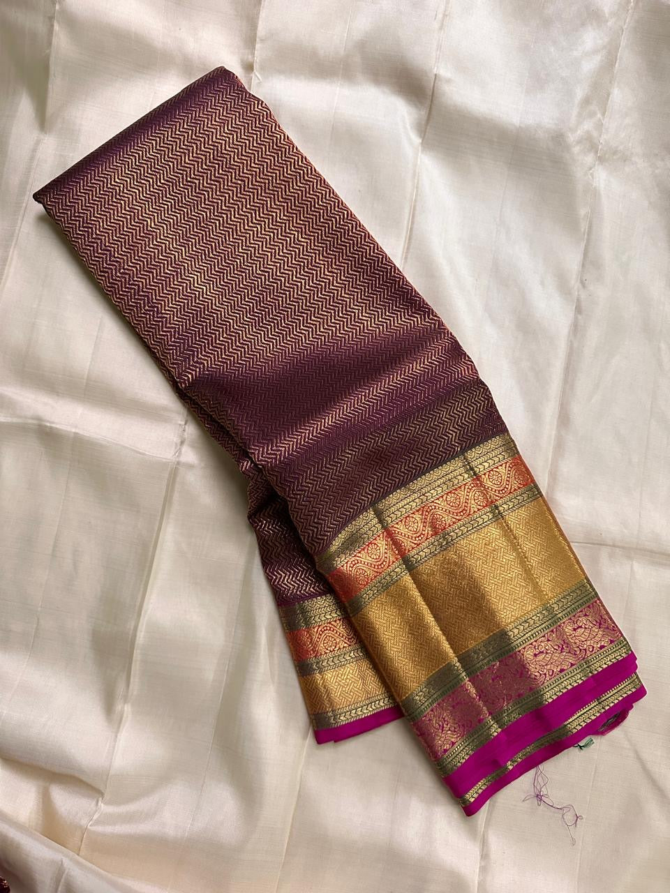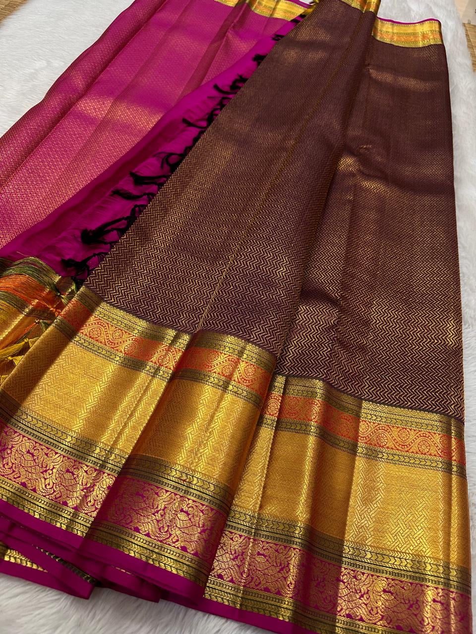 Kanchipuram pure silk chocolate, brown Zari chevrons with magenta varisaipet border