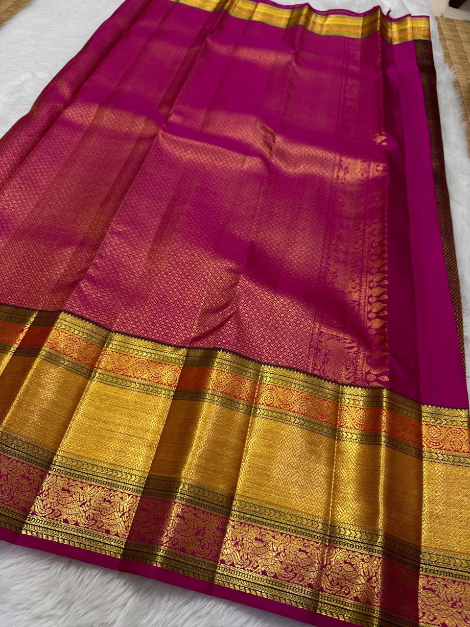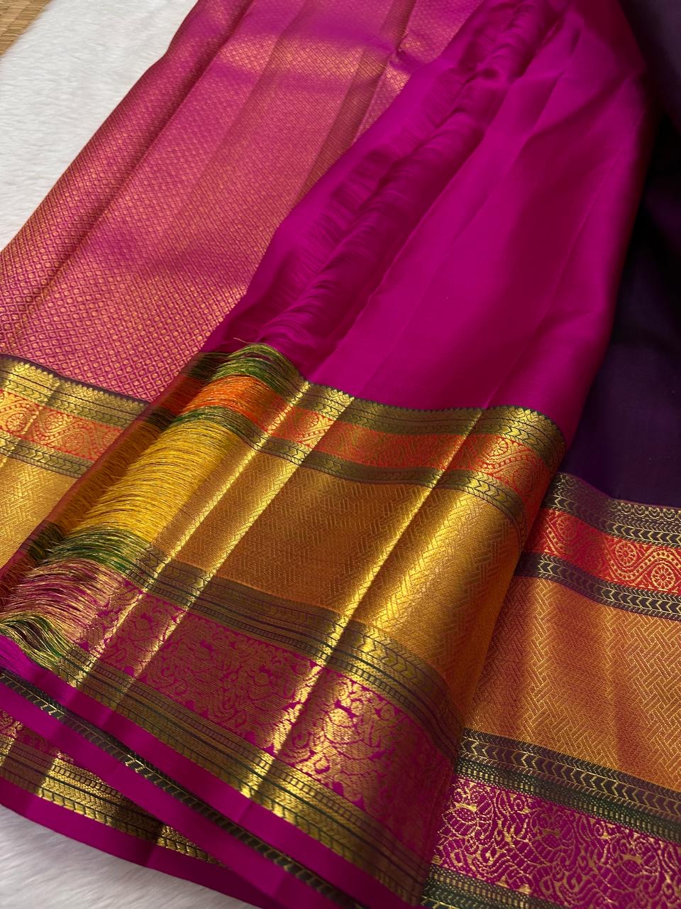 The highlight lies in its magenta Varisaipet border, an homage to the traditional temple-town weaving style, which creates a bold yet harmonious contrast against the brown. This vibrance continues into the magenta pallu, resplendent with intricate zari work, offering a striking finish to the saree’s design. Crafted with authentic 3G zari (certificate available), Vasini is a luxurious choice for festive occasions and heritage celebrations.