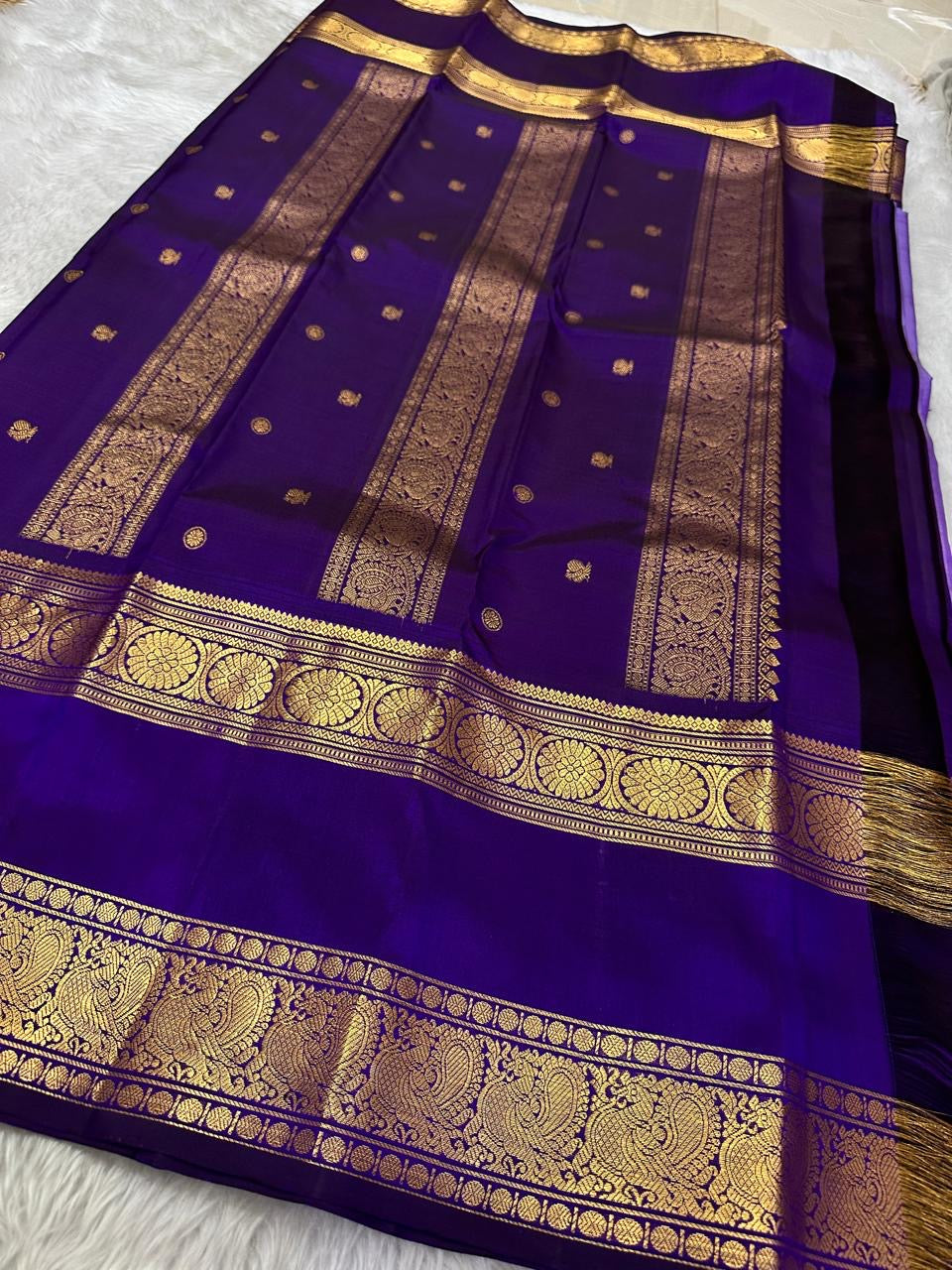 - Border & Pallu: Purple Rettapet with Ornate Zari Work