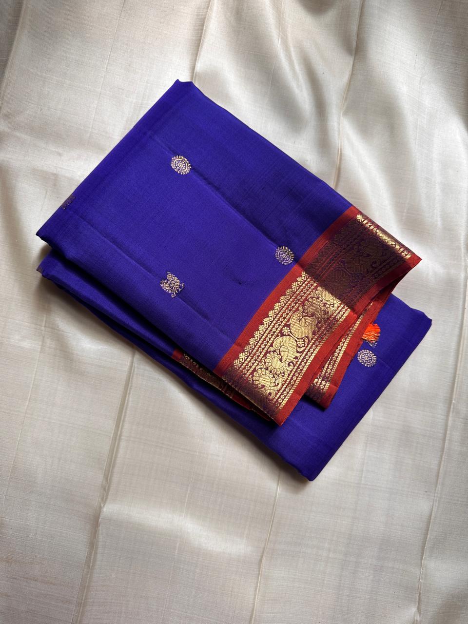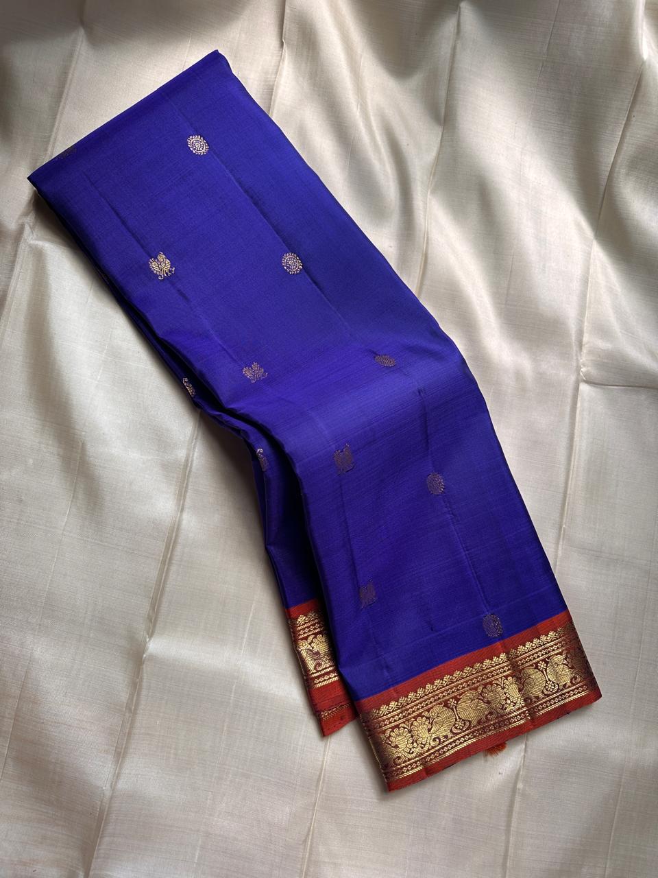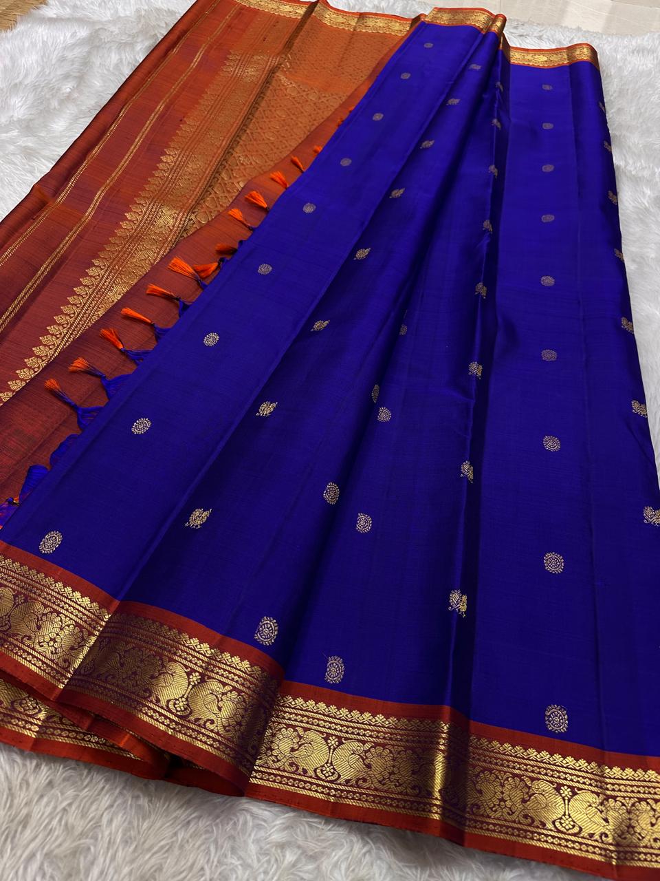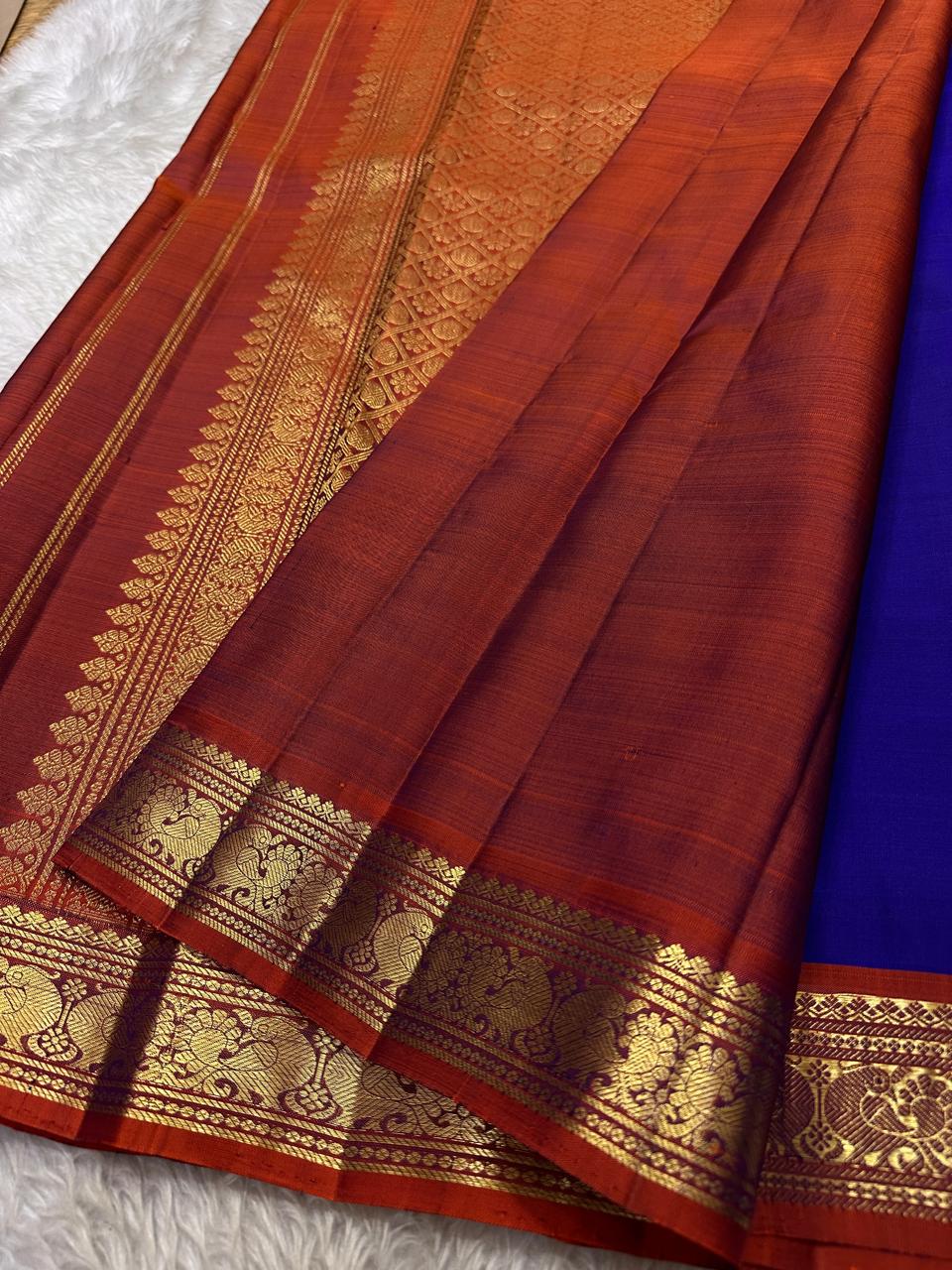 MS blue 💙 With rust orange border , Mayil chakram zari buttas pure silk Kanchipuram saree