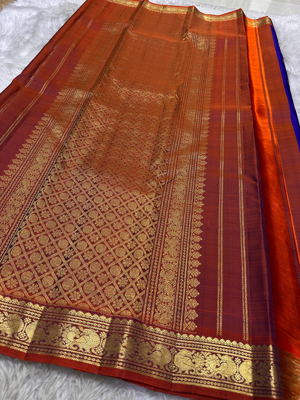 With rust orange border , Mayil chakram zari buttas pure silk Kanchipuram saree