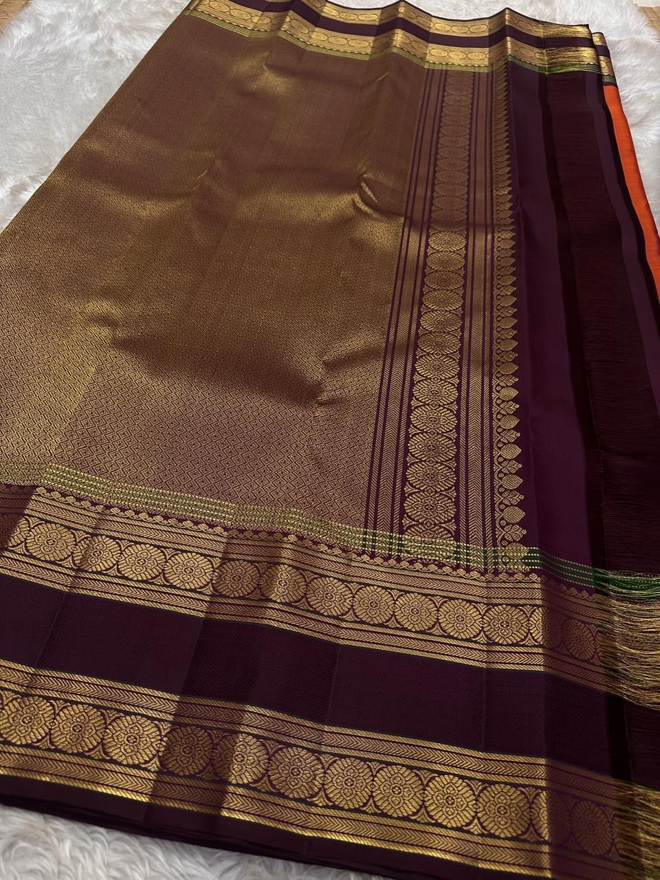 #Ishwaryam #KanchipuramSilk #HandwovenSaree #GandaberundaMotif #RettapetBorder #KamalamSeer #OrangeRustSilk #CoffeeBrownPallu #SilkMarkCertified #IdamSilks #IdamLiving #LuxurySilks #HeirloomWeaves #SouthIndianSilks #FestiveWear #TraditionalElegance